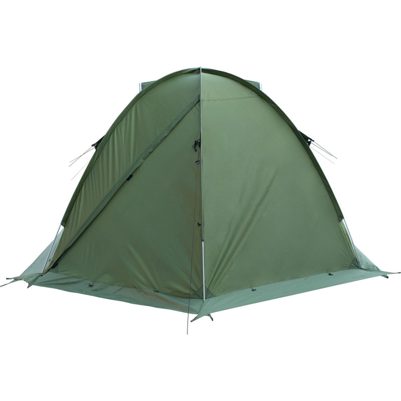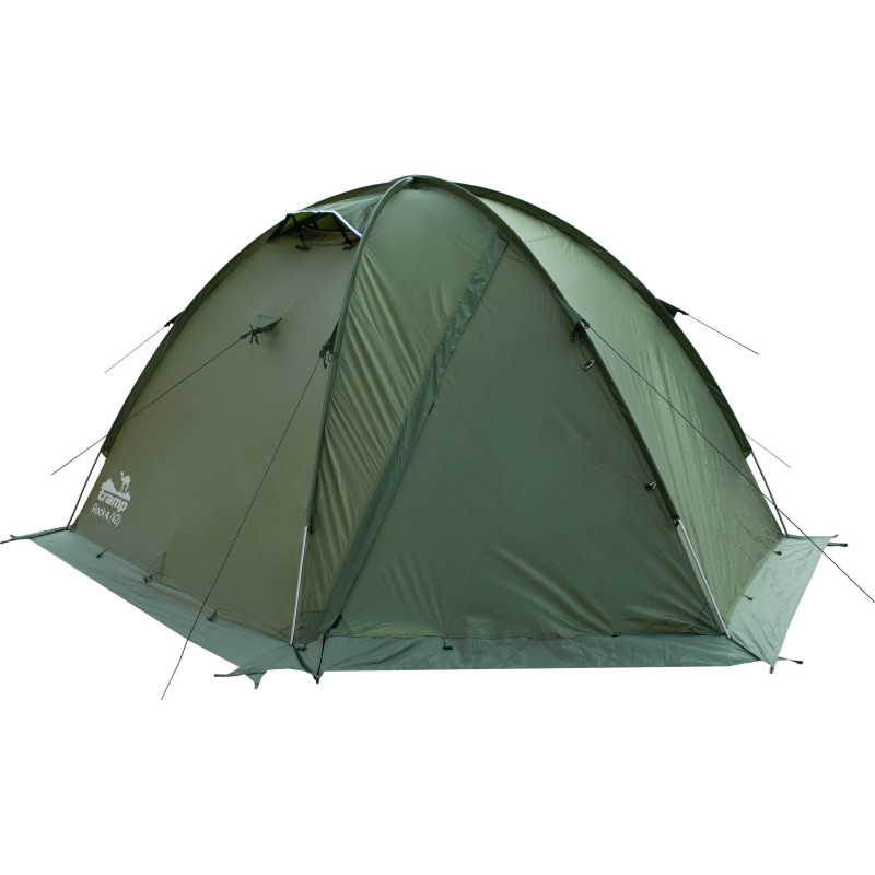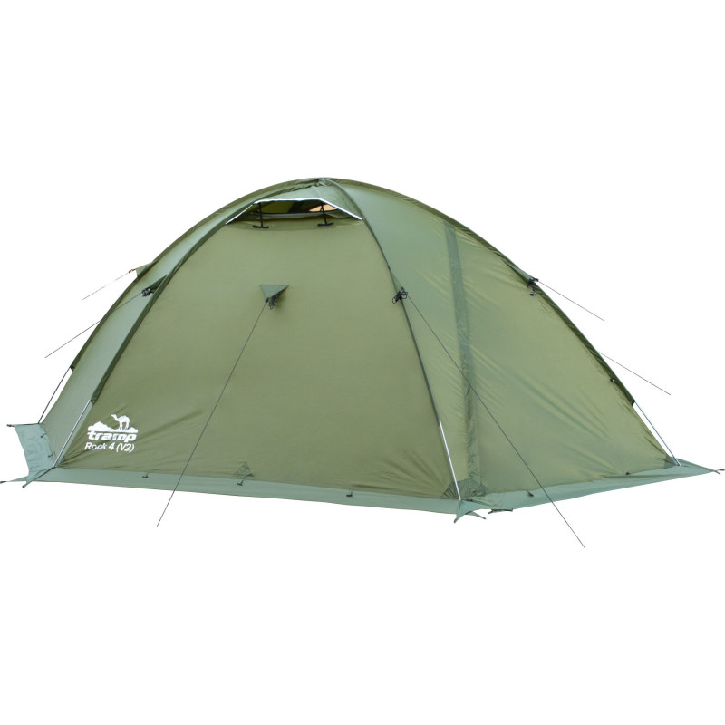 Тримісний експедиційний намет Tramp Rock 4 (V2) зелений з двома входами і двома тамбурами. Три зовнішні дуги забезпечують виняткову стійкість намету до сильного вітру, снігу та дощу.