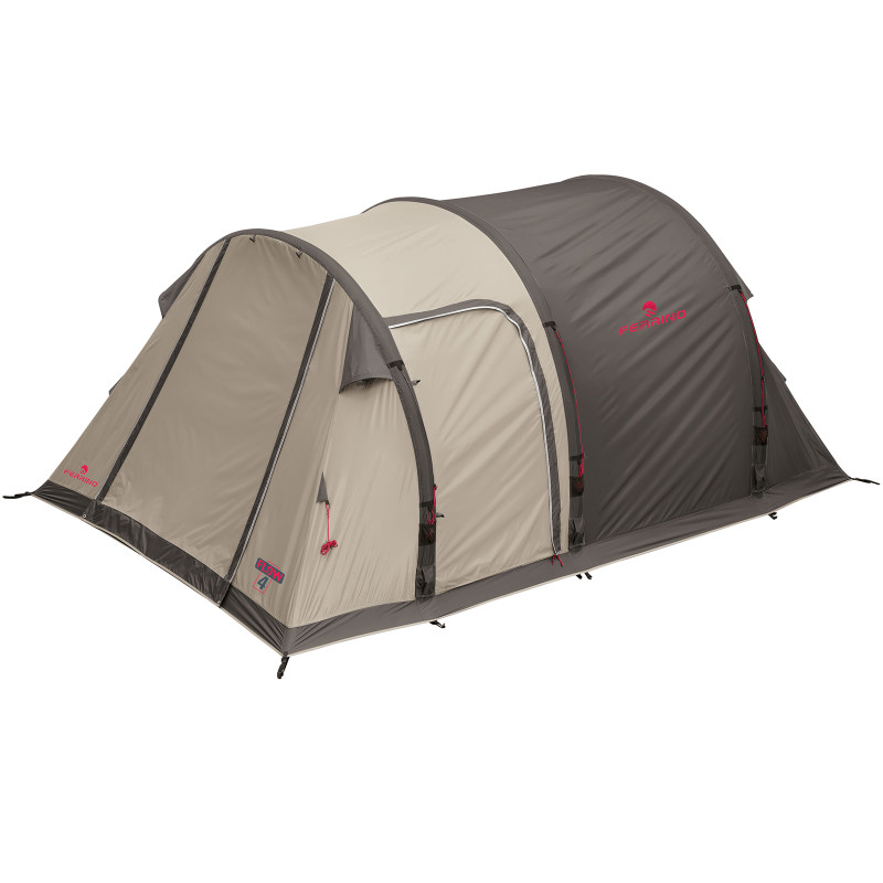 Сегодня палатки с надувным каркасом являются синонимом удобства отдыха на природе, и прочно ассоциируются с комфортным кемпингом. Палатка Flow 4 Brown относится к серии семейных палаток Ferrino и не оставит равнодушными большинство ценителей удобства отдыха под открытым небом. Конструкция каркаса состоит из трех независимых надувных арок, к которым уже присоеденены внешний тент и внутренняя палатка, что в разы ускоряет и упрощает установку. Достаточно нескольких минут, чтоб привести палатку в рабочее положение с помощью насоса. Три отдельных входа выделяют эту модель среди многих других кемпинговых палаток, значительно упрощая и делая более комфортным длительное проживание в ней. Flow 4 Brown имеет большой тамбур с двумя дверями, где можно обустроить небольшую походную кухню, расположить раскладную кровать, либо поставить стулья для отдыха. Четыре вентиляционных окна, и наличие москитной сетки всех дверей внутренней палатки и боковой двери внешнего тента гарантируют комфортный микроклимат и отсутствие насекомых в палатке. Дополнительный комфорт предоставляет перегородка, разделяющая внутреннюю палатку на два помещения. Учитывая двухслойную конструкцию, двухточечную систему штормовых оттяжек и наличие пола по всему периметру палатки, степень водозащиты вполне достаточна, чтоб, при правильной установке, сохранить палатку внутри сухой во время дождя. Чехол палатки закрывается на молнию, что очень удобно при упаковке палатки.