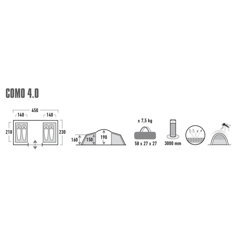 Обновленная модель кемпинговой палатки High Peak Como 4.0 станет надежным спутником в ваших путешествиях. Использование новых высококачественных материалов позволило повысить степень защиты отдыхающего от вредоносного воздействия ультрафиолетовых лучей в соответствии с стандартом - UV STANDARD 801. Внутренняя часть тента имеет специальное алюминизированное покрытие, которое обеспечивает дополнительную термоизоляцию. Эффективная система вентиляции VARIO VENT CONTROL на входах во внутренние палатки, обеспечивает комфортный микроклимат при любых погодных условиях. Две раздельные, затемненные спальни дают возможность отдохнуть не только ночью, но и в дневное время суток. Просторный тамбур позволяет легко разместить туристический инвентарь или организовать кемпинговую кухню. Антимоскитные сетки на входах в спальную комнату. Модель High Peak Como 4.0 станет хорошим выбором для использования, как в базовом лагере, так и для семейного отдыха на природе.