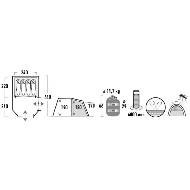 High Peak Meran 4.0 Light Grey/Dark Grey/Green (11806) - семейная туннельная палатка с двумя входами и гостиной со вшитым полом, который обеспечивает защиту от назойливых насекомых и нежелательных сквозняков. Жилая зона с высотой потолка 1,9 м имеет достаточно места для размещения кемпинговых стульев, стола и походного снаряжения. Две сетчатые двери увеличивают приток свежего воздуха и защищают от насекомых. Прозрачные окна в жилой зоне наполнят помещение светом, а шторы при необходимости обеспечат уединение. Крыша имеет теплоотражающее алюминизированное покрытие, снижающее повышение температуры внутри палатки днем в солнечную погоду.