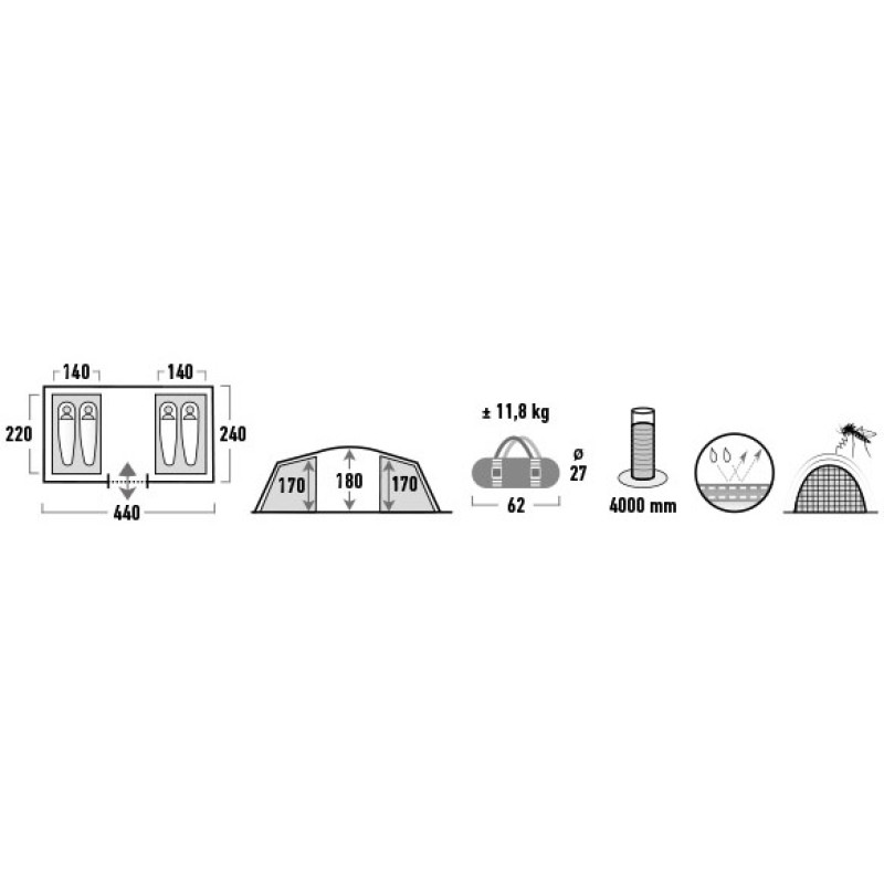 - Габариты внешней палатки (ДхШхВ), мм: 4400 x 2400 x 1800