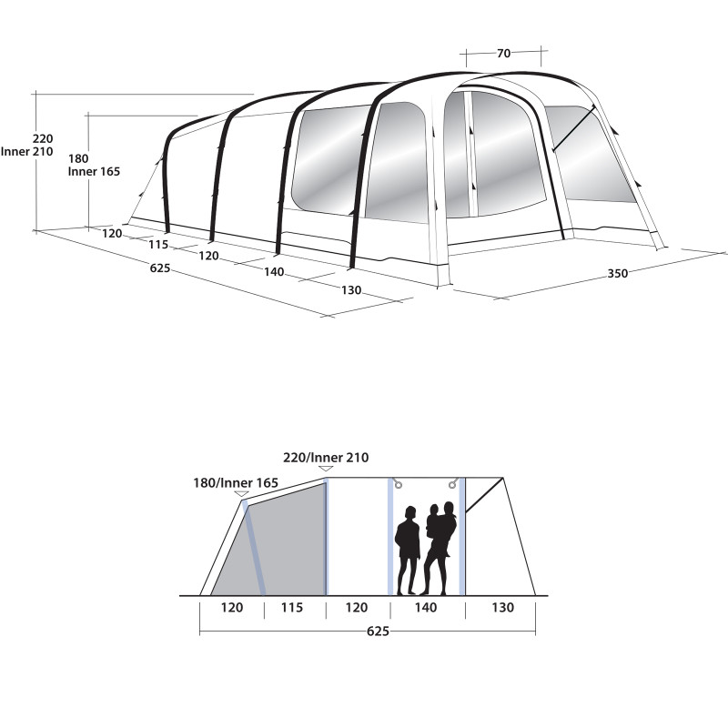 • Outwell Rigid Air System - опорные балки каркаса палатки надуваются и сдуваются независимо друг от друга благодаря удобному доступу к спусковым клапанам.