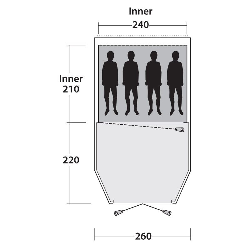 - Внутренняя палатка (Д х Ш х В): 210 х 240 х 185 см