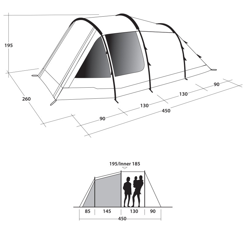 - Внешний тент (Д х Ш х В): 450 х 260 х 195 см
