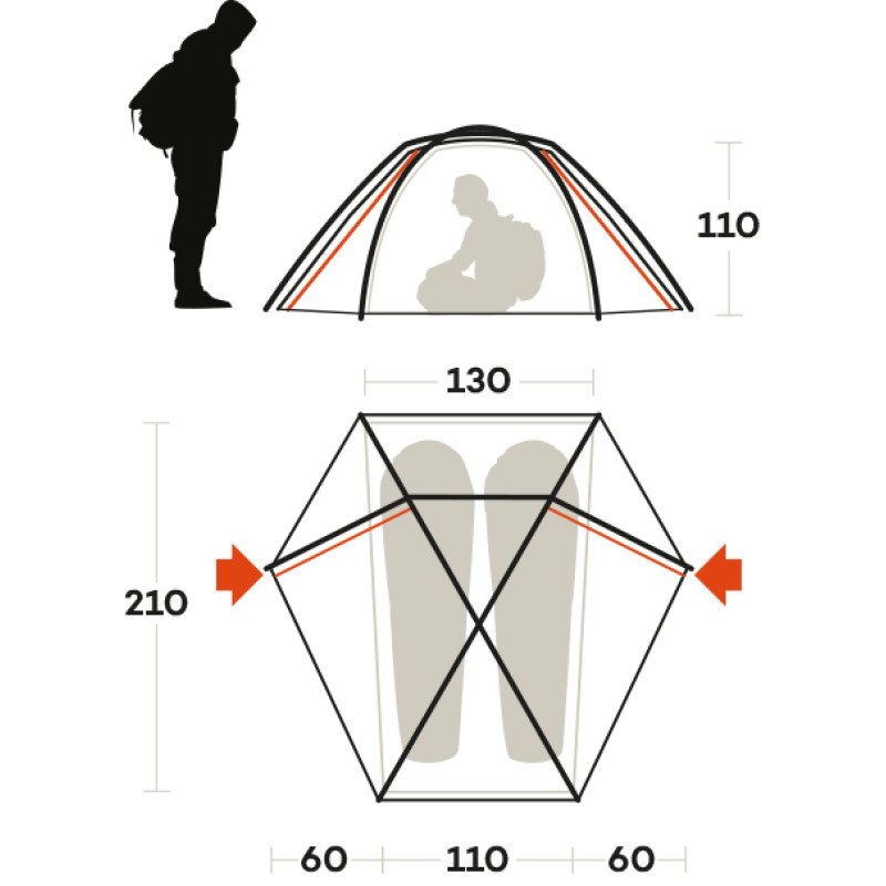 - Нестандартная купольная полугеодезическая конструкция каркаса с тремя дугами призвана значительно увеличить устойчивость палатки благодаря шести точкам опоры и трем точкам пересечения дуг. Такая конструкция является свободностоящей, сохраняя возможность установки палатки без фиксации колышками, что особенно важно при установке на снегу, песке или в местах, где рельеф не позволяет надежно зафиксировать колышки. Кроме того, такая конструкция надежно фиксирует оба входа в палатку.