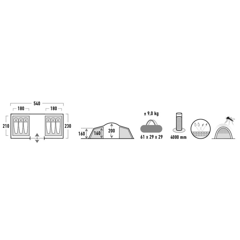High Peak Como 6.0 Dark Grey/Green (10263) - универсальная шестиместная палатка с широкими спальными местами слева и справа, она станет надежным спутником в Ваших путешествиях благодаря большому внутреннему пространству и дополнительному комфорту. Куполообразная жилая зона позволяет стоять в полный рост, а сетчатые вентиляционные отверстия под крышей улучшают циркуляцию воздуха и избавляют от образования конденсата. Также на противоположных концах палатки расположены два регулируемых вентиляционных отсека для оптимального проветривания внутреннего пространства. Прозрачное окно из ПВХ на входной двери способствует проникновению света внутрь палатки, а штора на нем обеспечивает конфиденциальность в случае необходимости. Эффективная система вентиляции спален Vario Vent Control создает комфортный микроклимат при любых погодных условиях. Две раздельные затемненные спальни дают возможность выспаться не только ночью, но и в дневное время суток. Просторная гостиная позволяет разместить туристический инвентарь или организовать кемпинговую кухню. Палатка High Peak Como 6.0 Dark Grey/Green (10263) станет хорошим выбором для использования как в базовом лагере, так и для семейного отдыха на природе.