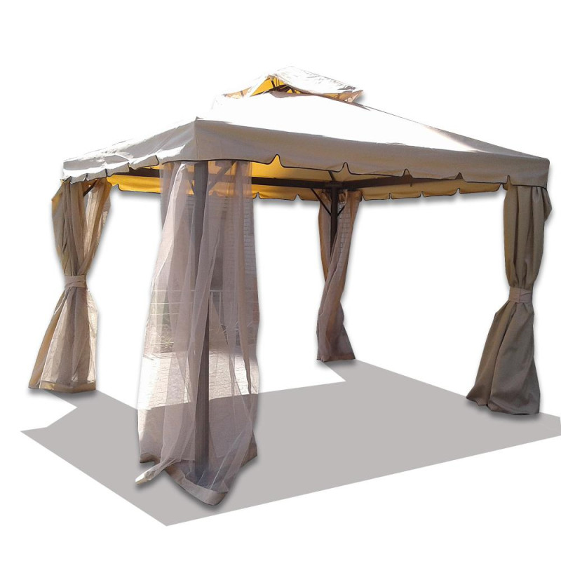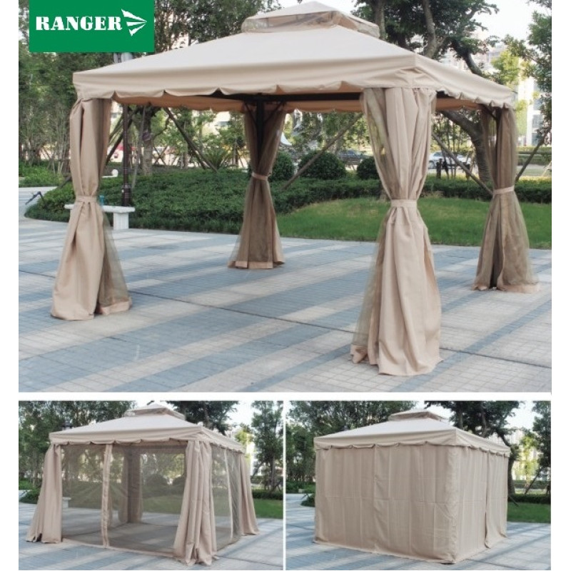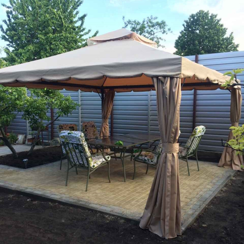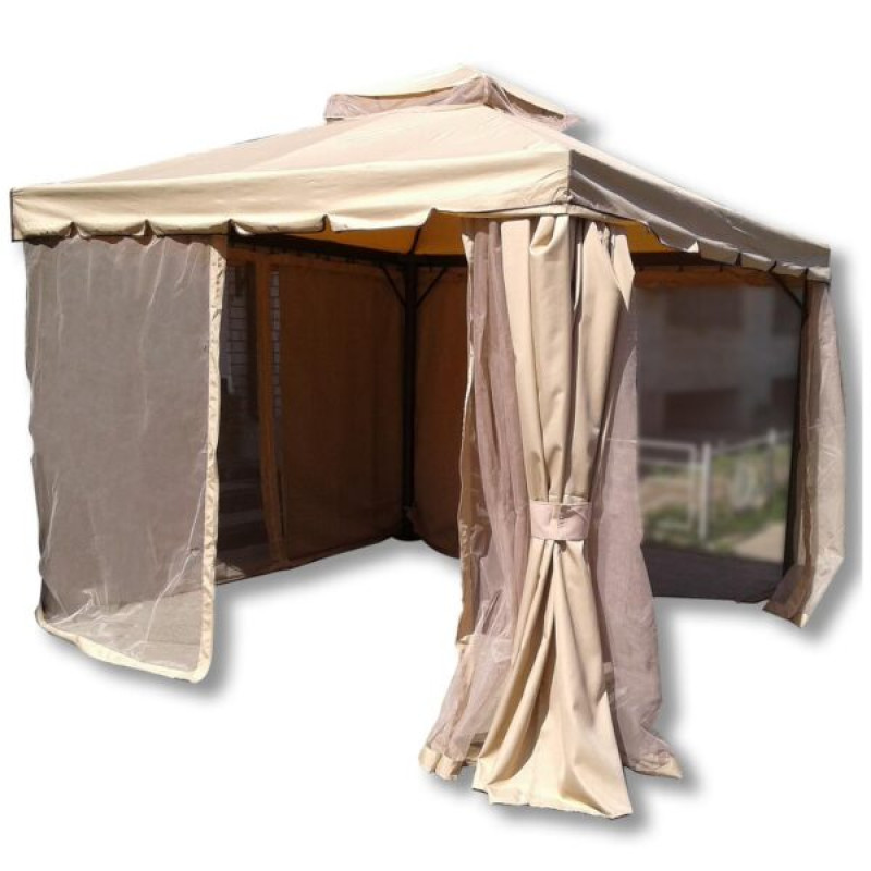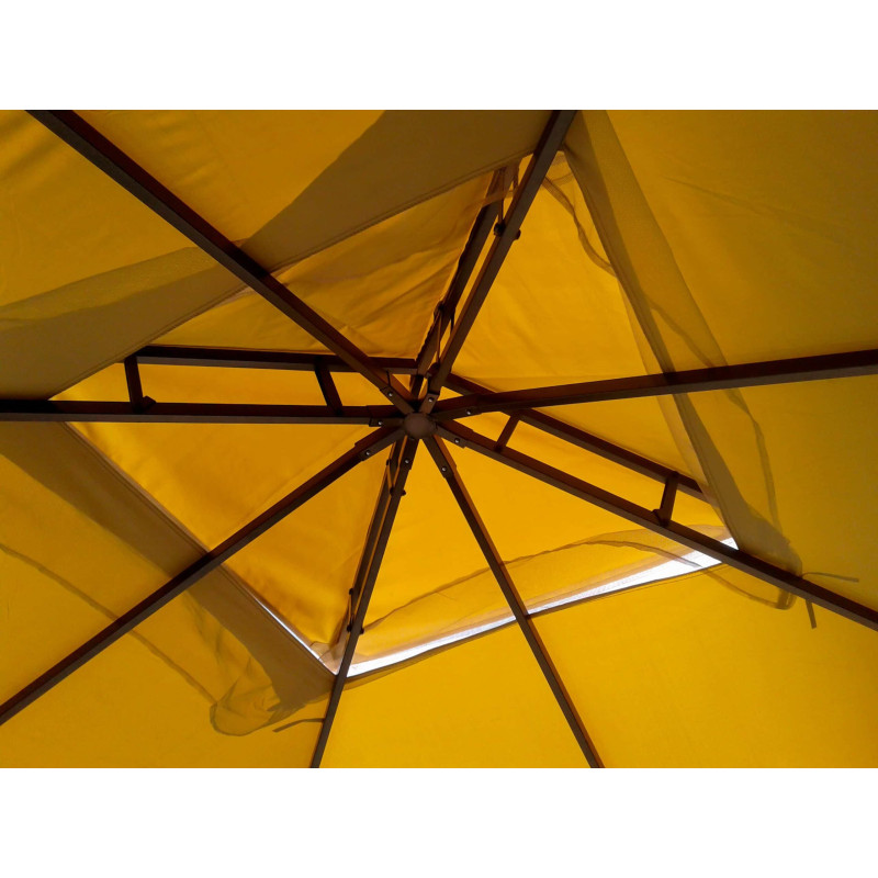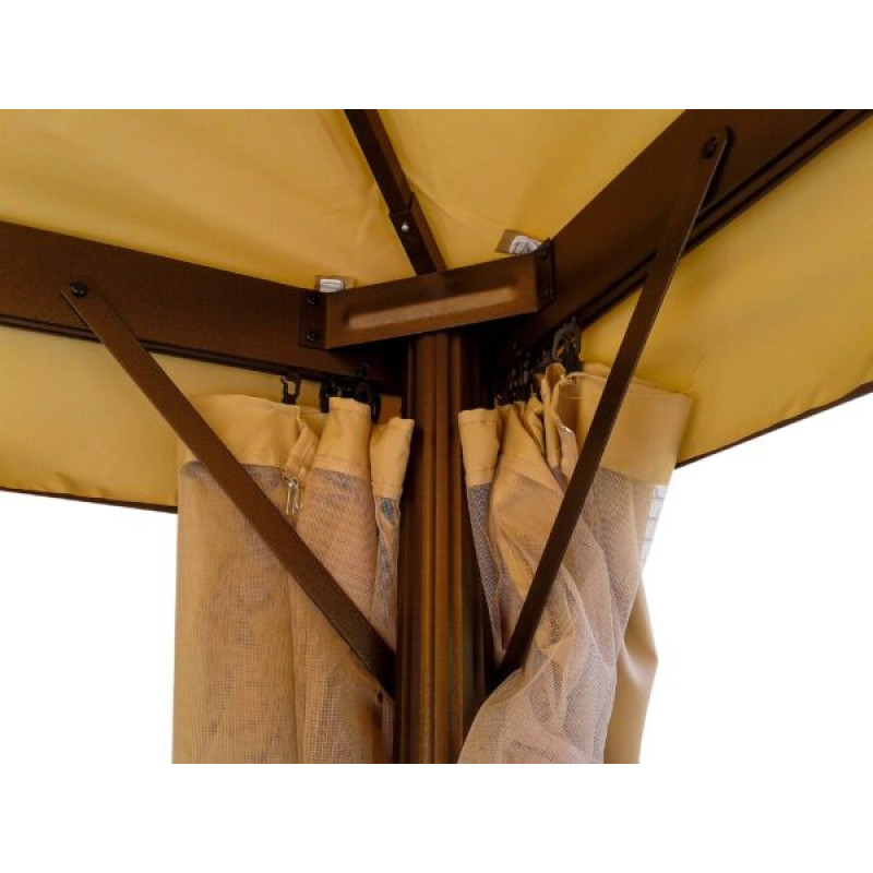 Шатер для садового павильона Ranger «Отрада» 3х3 метра. (без металлического каркаса) Ткань с пропиткой защищает от промокания и проникновения ультрафиолетовых лучей. Только верхняя часть без боковых стоек и ткани. Необходимо заменить верхнюю часть, порвало ветром или лопнула ткань, вы легко сможете заменить ее при помощи данного шатра. Решили изготовить беседку самостоятельно — шатер для павильона Отрада. Вам в помощь, делаете каркас, а элегантная крыша уже имеется. Крепится на липучках и дополнительно предусмотрены крючки для лучшей фиксации.Благодаря наличию воздушного клапана порывы ветра не могут повредить конструкцию. Садовый павильон служит не один сезон, так как изготовлен из прочных материалов.Уютное пространство позволяет разместить под пологом павильона любой набор садовой мебели, качели. В таком уютном месте можно расположиться с книгой, с ноутбуком или рукоделием. Можно поиграть с компанией, посидеть за столом, а можно и расположиться на ночь тёплой летней ночью.Характеристика:— материал: полиэстер 260G, противомоскитная сетка;— цвет: бежевый, коричневый;— размер в разложенном виде: 3х3 м;— вес: 2 кг.