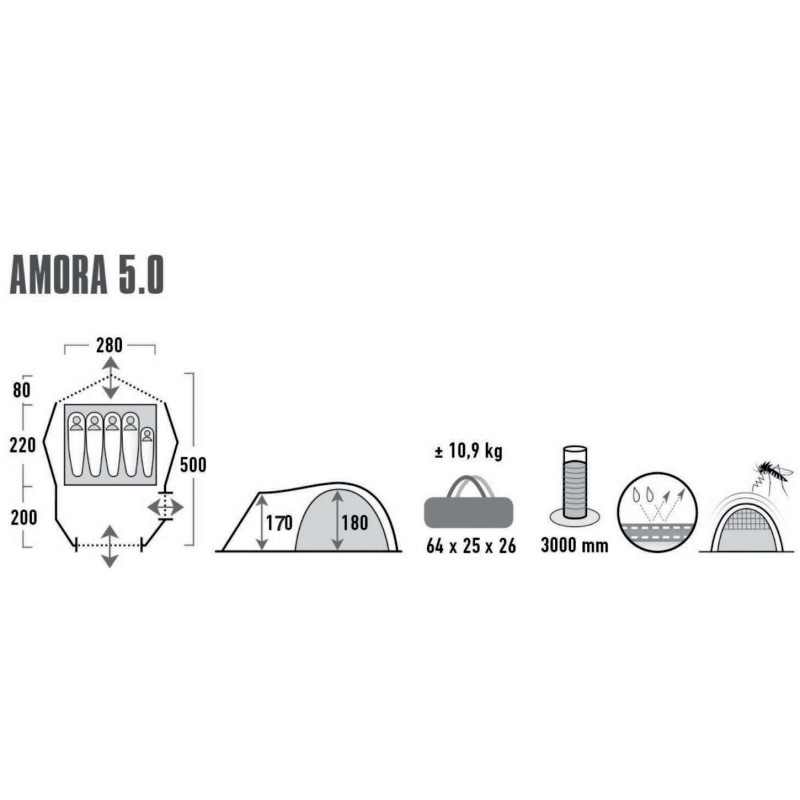 Палатка премиум-класса High Peak Amora 5.0 с инновационной системой вентиляции, создаст уют и комфорт для 5 человек. Наличие двух регулируемых систем вентиляции Adanced Low Vent и Vario Vent Control способствуют созданию в палатке максимально комфортного микроклимата при любых погодных условиях. Просторная, затемненная спальня дает возможность отдохнуть не только ночью, но и комфортно восстановиться после полудня, создав свою сиесту. Использование новых высококачественных материалов позволило повысить степень защиты человека от вредного воздействия ультрафиолетовых лучей в соответствии с стандартом - UV STANDARD 801. Внутренняя часть тента имеет специальное алюминизированное покрытие, которое обеспечивает дополнительную термоизоляцию. Два раздельных тамбура позволят разместить туристический инвентарь. Антимоскитные сетки расположены на 3-ох входах в палатку, а также на входе в спальную комнату.