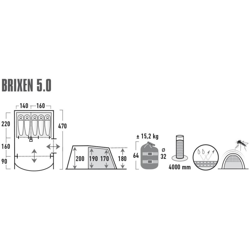 High Peak Brixen 5.0 - семейная туннельная палатка с двумя входами, гостиной со вшитым полом, который обеспечивает защиту от назойливых насекомых и нежелательных сквозняков. Интегрированный навес создает тень и помогает предотвратить попадание дождя внутрь при открывании двери. Жилая зона с высотой потолка 2 м имеет достаточно места для размещения кемпинговых стульев, стола и походного снаряжения. Сетчатое окно со шторой на фронтальных дверях обеспечивает постоянный приток свежего воздуха в палатку. Боковая сетчатая дверь увеличивает приток свежего воздуха и защищает от насекомых. Прозрачные окна в жилой зоне наполнят помещение светом, а шторы при необходимости обеспечат уединение. Крыша имеет теплоотражающее алюминизированное покрытие, снижающее повышение температуры внутри палатки днем в солнечную погоду. Изобретенная компанией High Peak система вентиляции Dual Flow Vent System «3 в 1» обеспечивает отличную циркуляцию воздуха в спальной зоне палатки.