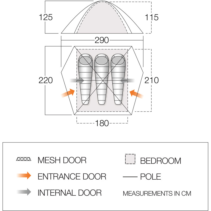 • Внешняя палатка (ДхШхВ): 220 х 290 х 125 см