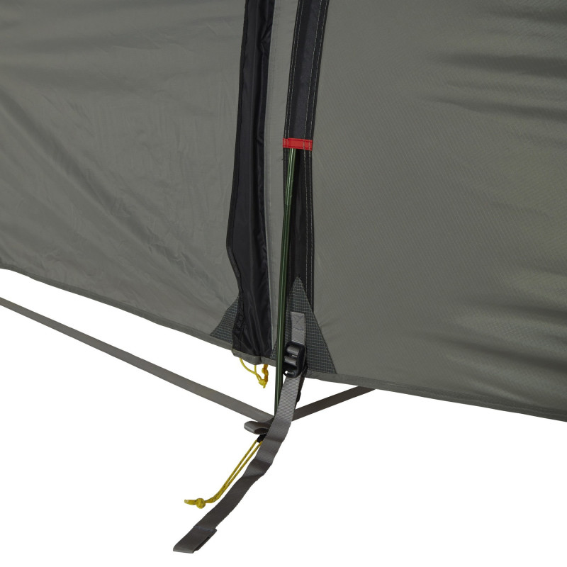 • Спеціальний фастекс червоного кольору регулює співвідношення довжини намету і довжини тамбура. При необхідності можна зробити довшим внутрішній намет і розмістити в ньому необхідні речі, або збільшити тамбур, надавши внутрішньому намету стандартні розміри, і розмістити в тамбурі більше речей, або організувати ще одне мале спальне місце довжиною 180 см.