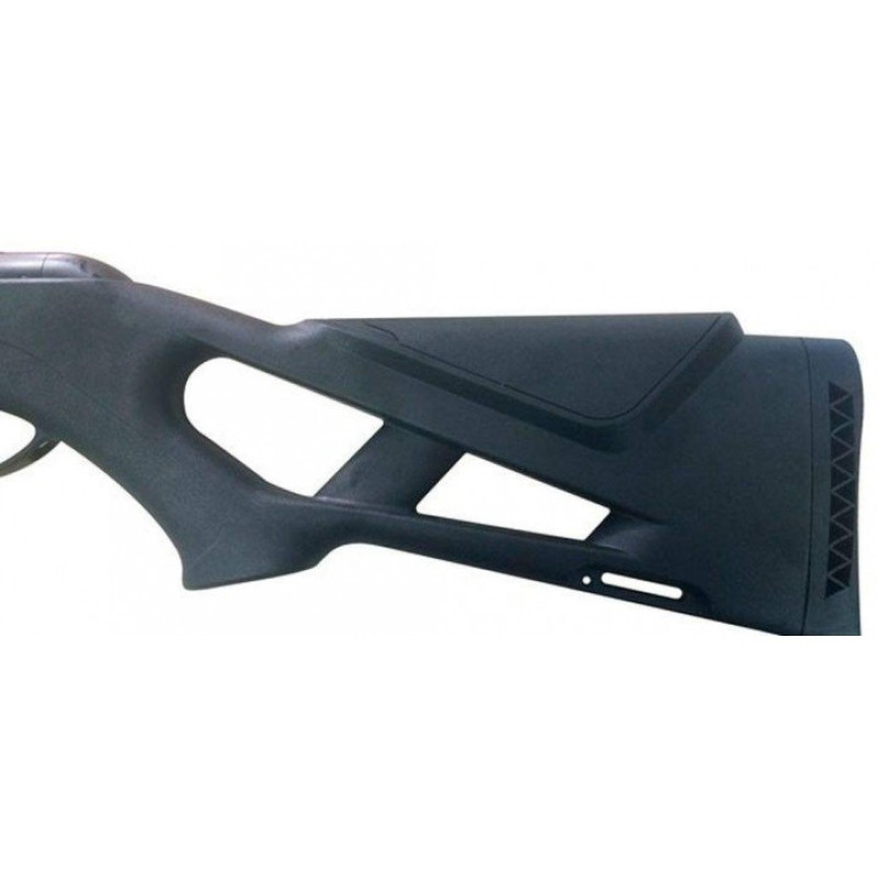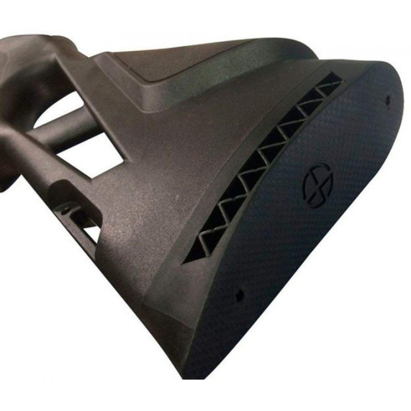 Приклад винтовки достаточно необычной формы, но очень удобный и эргономичный. Его тыльная часть выполнена из мягкой резины с тиснённым логотипом для комфортного упора при прицеливании и использовании винтовки.Для стрельбы из винтовки используются свинцовые пульки калибром 4,5 мм. Скорость пули составляет около 320 м/с, что является достаточно хорошим результатом работы всех механизмов пневматики.
