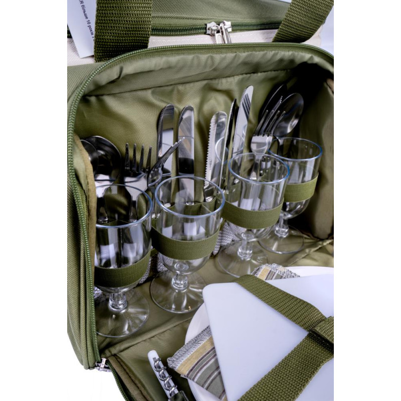 Набор для пикника Ranger Lawn– здесь собрано всё, что вам понадобится, для отдыха на природе. Эта модель рассчитана для компании из четырёх человек. В сумке изотермический отдел, в котором продукты сохранятся свежими, напитки прохладными и всё доедет до места в целости и сохранности.Накрыть стол и салфетками из хлопчатобумажной ткани, сервировать столовыми приборами – вилками, ложками и ножами, поставить на стол тарелки, бокалы, перечницу и солонку – всё готово! Дощечка для нарезки тоже под рукой, да и хлебный нож не забыт, открывалка для бутылок и банок. Вся посуда изготовлена из высококачественного пластика и пищевой стали. Внутренняя часть выполнена из светоотражающей ткани, которая дольше сохраняет температуру и делает форму набора более жесткой, более эластичная при низких температурах – PEVA не дубеет и не трескается на морозе в местах излома. При изготовлении используются безвредные для жизни и здоровья материалы, долговечны, просты в уходе. Для удобства комплектуется ручками для переноса и дополнительно идет плечевой ремень, с регулировкой длины.Сумка к набору для пикника — очень вместительная и компактная. Вы обязательно оцените удобный и практичный набор для пикника на 4 персоны.Характеристики:В комплект посуды входит: тарелки – 4шт; бокалы -4шт; ложки — 4шт; вилки — 4шт; ножи — 4шт; нож для хлеба — 1шт; солонка и перечница (2в1) – 1шт; открывалка, штопор, нож (3в1 складной) – 1шт; дощечка для нарезки – 1шт; салфетки – 4шт.— материал сумки: Нейлон 600D, изотермический наполнитель, PEVA;— цвет: оливковый, бежевый;— размер в разложенном виде: 30х36х26 см (ВхДхШ);— толщина изотермического наполнителя: 6 мм;— размер термоотдела: 27,5х34х20 см (ВхДхШ);— объем термоотдела: 20 литров;— вес: 1,75 кг.[embed]https://youtu.be/o7wF7VXrJ8s[/embed