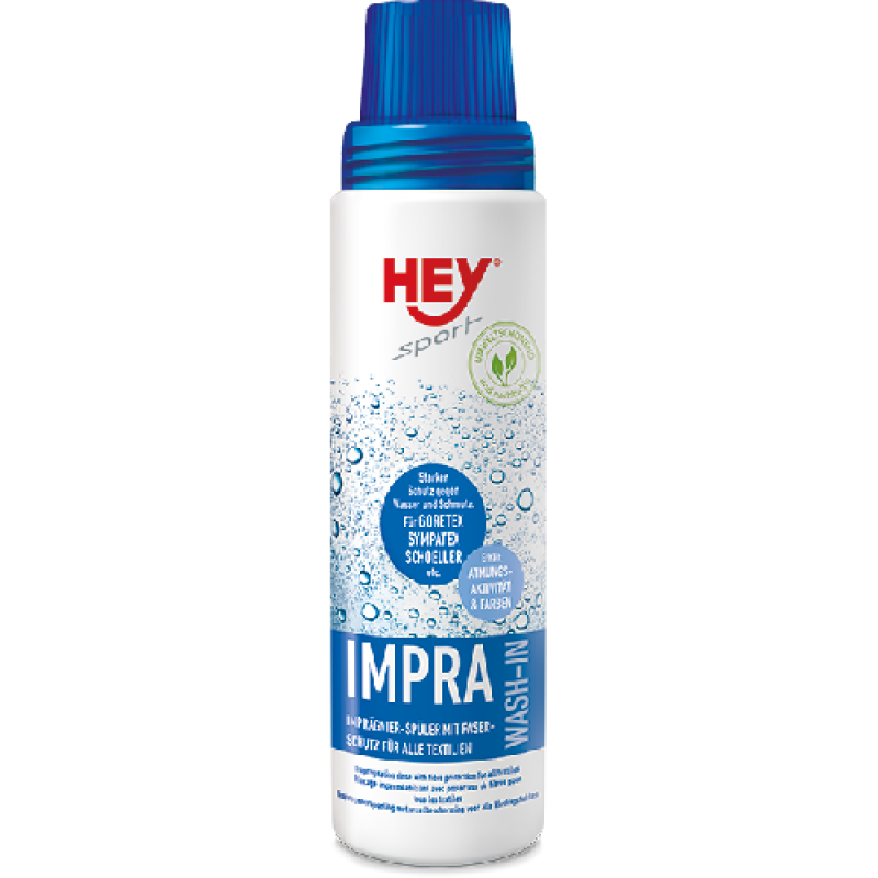 Зверніть особливу увагу, що навіть дуже якісні вироби з функціональних матеріалів вимагають просочення, як тільки волога перестає стікати (відштовхуватися від) з поверхні виробу і тканина починає промокати. Спортивний одяг, одяг для активного відпочинку вимагає періодичної просочення. Для збереження функціональних якостей мембрани ми рекомендуємо просочення виробів засобами HEY-Sport IMPRA WASH-IN і HEY-Sport TEX COMPLETE IMPREGNATION. Перед цим виріб має бути випраний з використанням HEY-Sport TEX WASH і підготовлено до просочення.