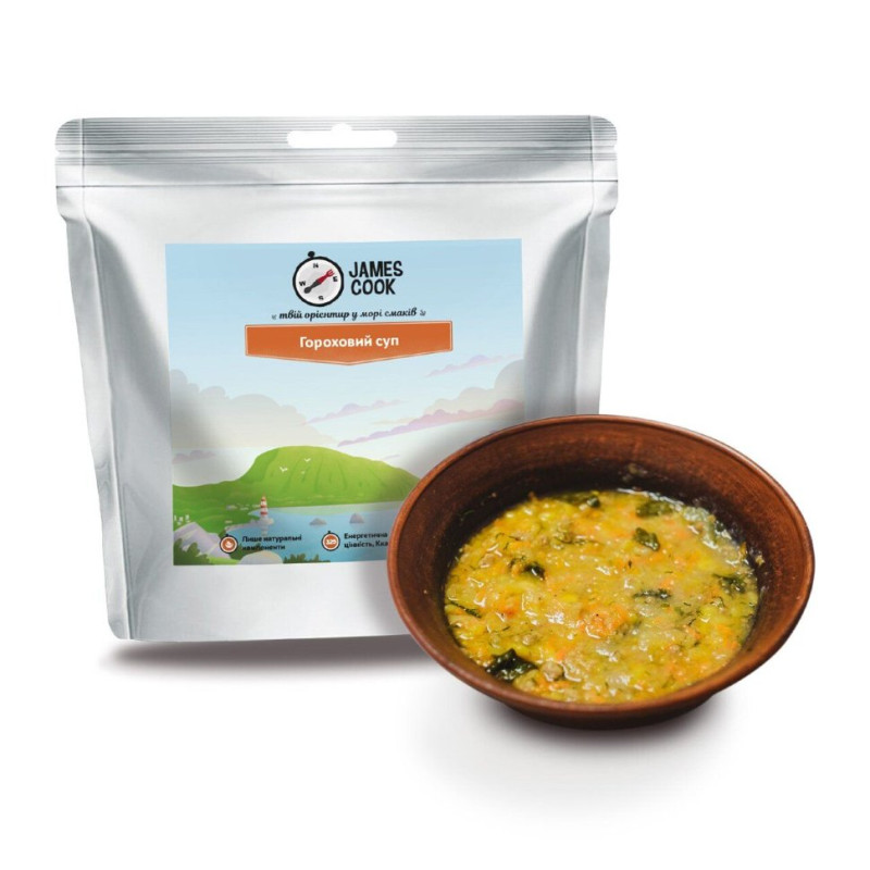 Гороховий суп James Cook приготований із збереженням традиційної рецептури. Ситний, запашний і надзвичайно смачний. Безсмертна класика похідних обідів. При приготуванні використовуються тільки натуральні компоненти без барвників і підсилювачів смаку. Похідна їжа James Cook приготована шляхом сушіння готових продуктів, і саме з цього її смак точно такий же як і страв, приготованих будинку.