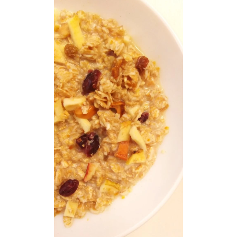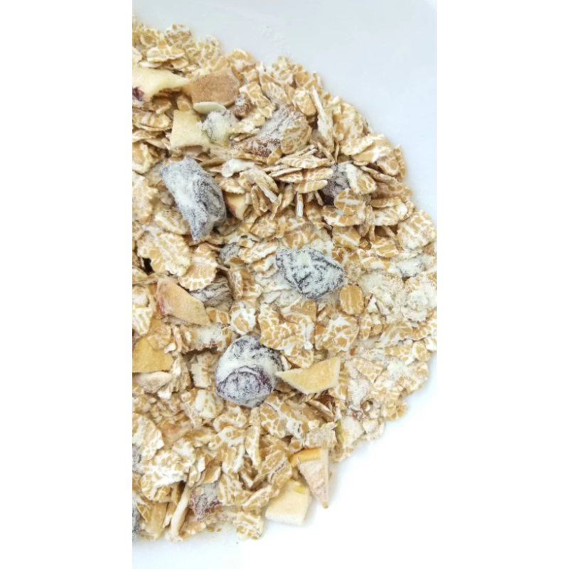 Склад: пшеничні пластівці, родзинки, абрикос, яблуко, сухе молоко, журавлина, цедра апельсина, цукор.