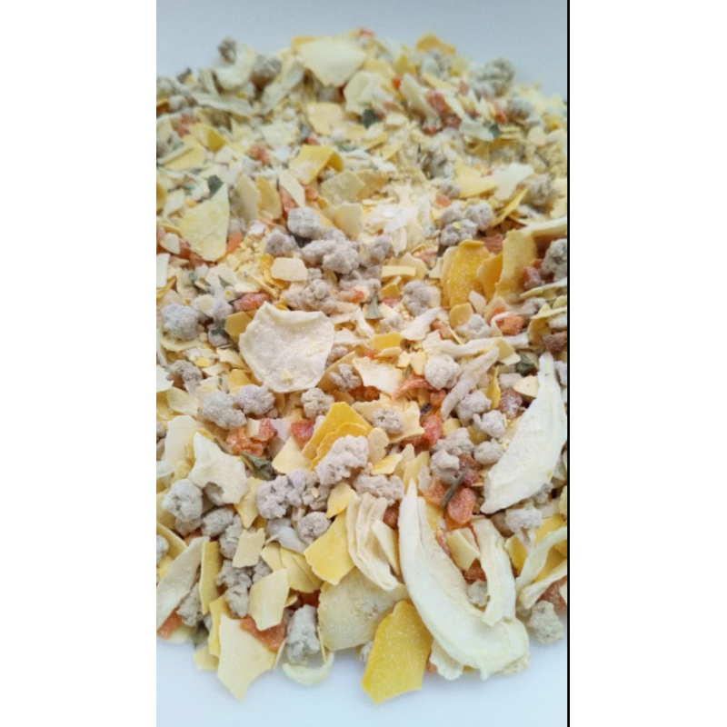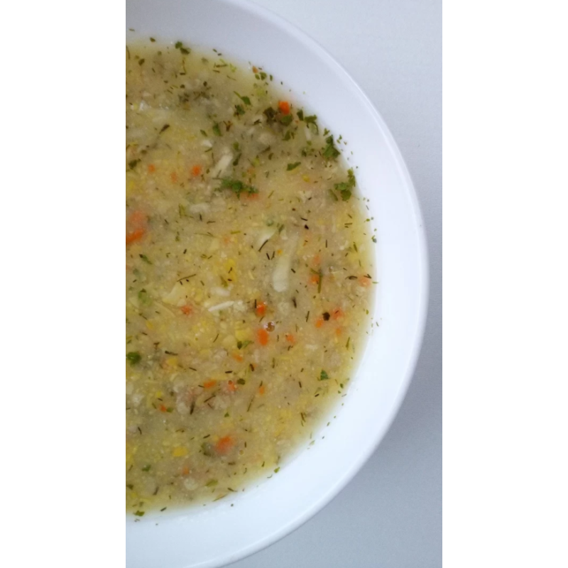 Склад: Горохові пластівці, картопляні пластівці, варено-сушена курка (11%), морква, цибуля смажена, кріп, часник, петрушка, перець чорний, сіль.
