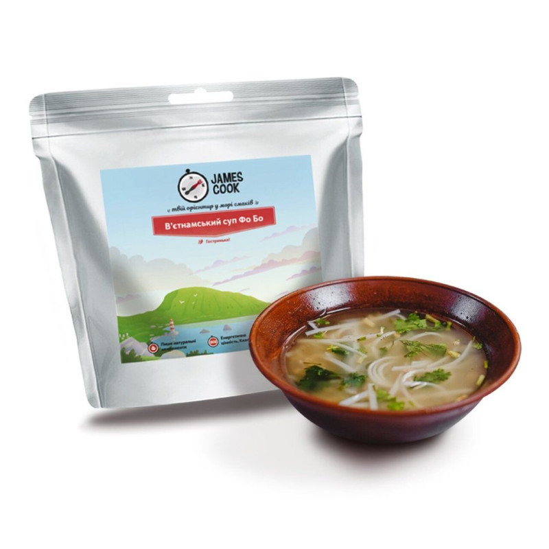Завдяки в'єтнамської діаспори Фо готують по всьому світу. Кінза надає супу особливий тонкий аромат, а рисова локшина нагадає вам про його далекосхідному походження. До речі, Фо – досить гострий суп. Прекрасний освіжаючий рішення для обіднього перекусу, Вносить приємну різноманітність у вашому меню. При приготуванні використовуються тільки натуральні компоненти без барвників і підсилювачів смаку. Похідна їжа James Cook приготована шляхом сушіння готових продуктів, і саме з цього її смак точно такий же як і страв, приготованих будинку.