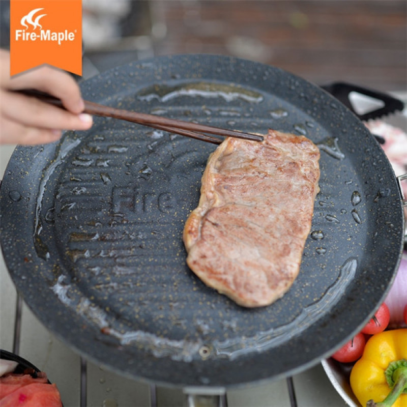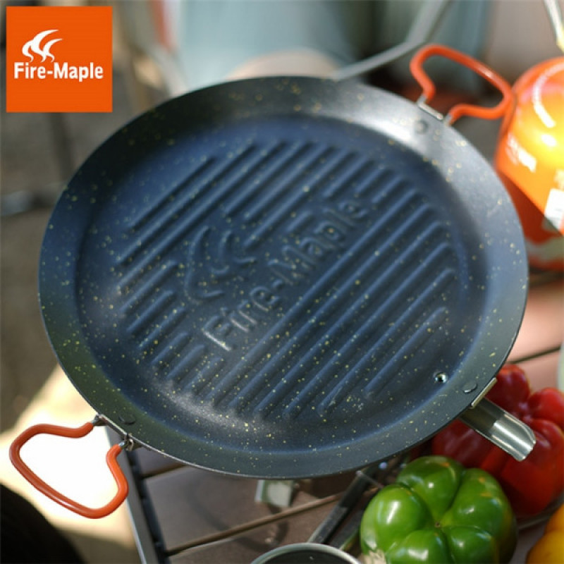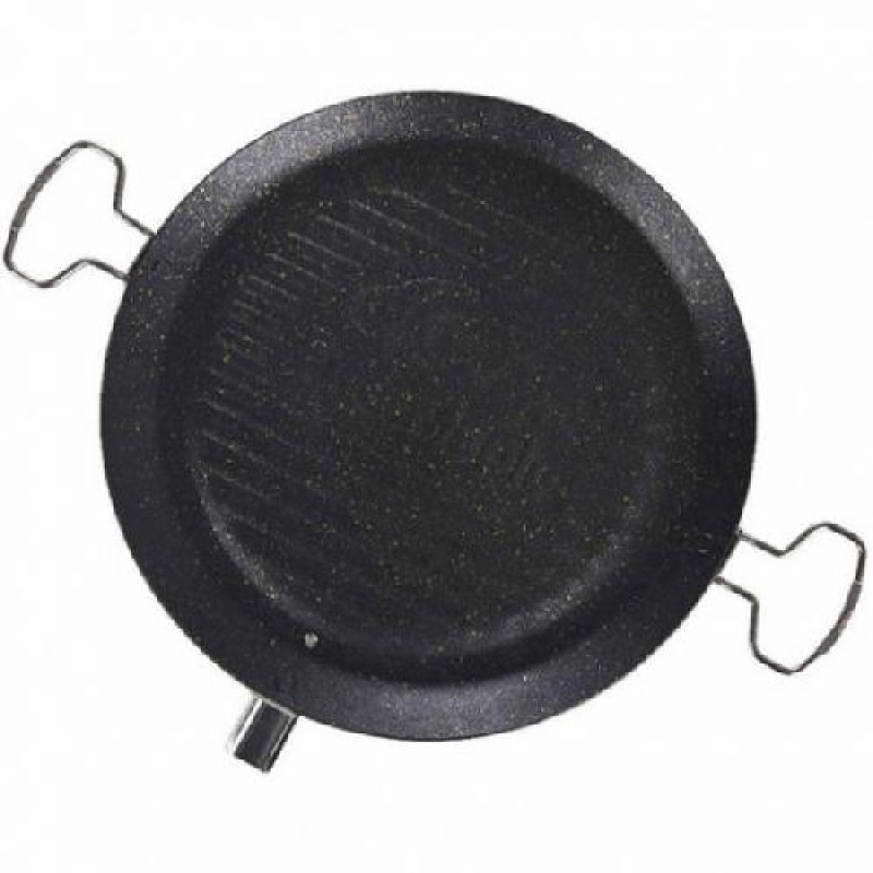 Сковорода для барбекю з антипригарним покриттям. Матеріал: анодований алюміній з тефлоновим покриттям з рифленим дном і складною ручкою з фіксатором. Має отвір для злиття надлишків олії.