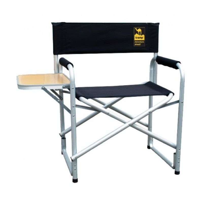 Директорський стілець із столом досить легко і зручно складається, що дає йому ряд переваг - це мобільність, компактність і комфорт. Опорна конструкція зібрана на міцних алюмінієвих трубах, діаметр яких становить 25 мм, а їх товщина - 1,2 мм. В якості тканинної основи використовується двошаровий матеріал – oxford, щільністю 600D. До того ж, для зручності експлуатації обраний не мазкий чорний колір. На спинку стільця нанесений логотип фірми-виробника. В комплект входить складаний столик.