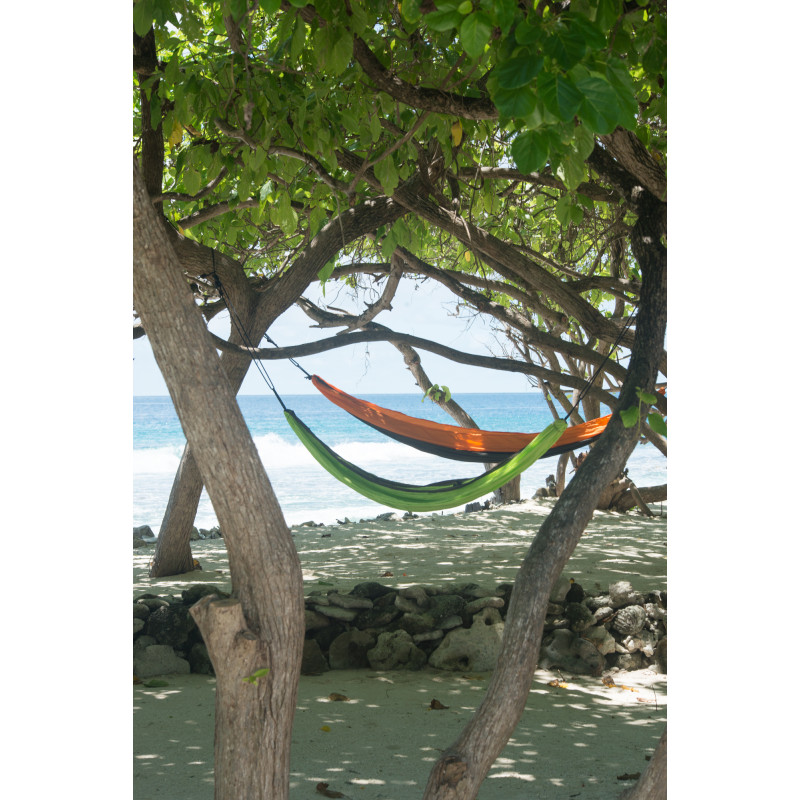 Туристический гамак Colibri можно без проблем использовать в качестве покрывала для пляжа благодаря тому, что петли для подвешивания подвесных гамаков этой модели легко демонтируются.