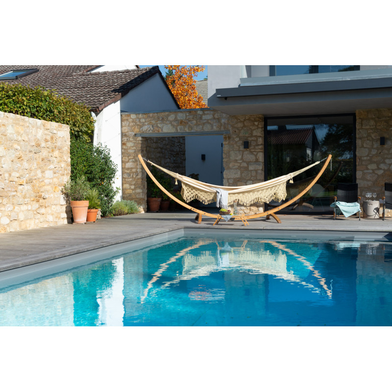 Изюминкой данной модели является отделка краев кружевами ручной работы. Изящные кружева гармонично сочетаются с бразильским макраме, которое соединяет сукно для лежания и канаты для крепления. Украшенная бахромой плетеная сеть – это не только эстетическое украшение, но и практичное решение, так как прочная сетка обеспечивает равномерное распределение массы тела по всему сукну. Сочетание насыщенного цвета бордо и легкого лилового цвета придает дизайну изысканность и подчеркивает отменный вкус владельца.