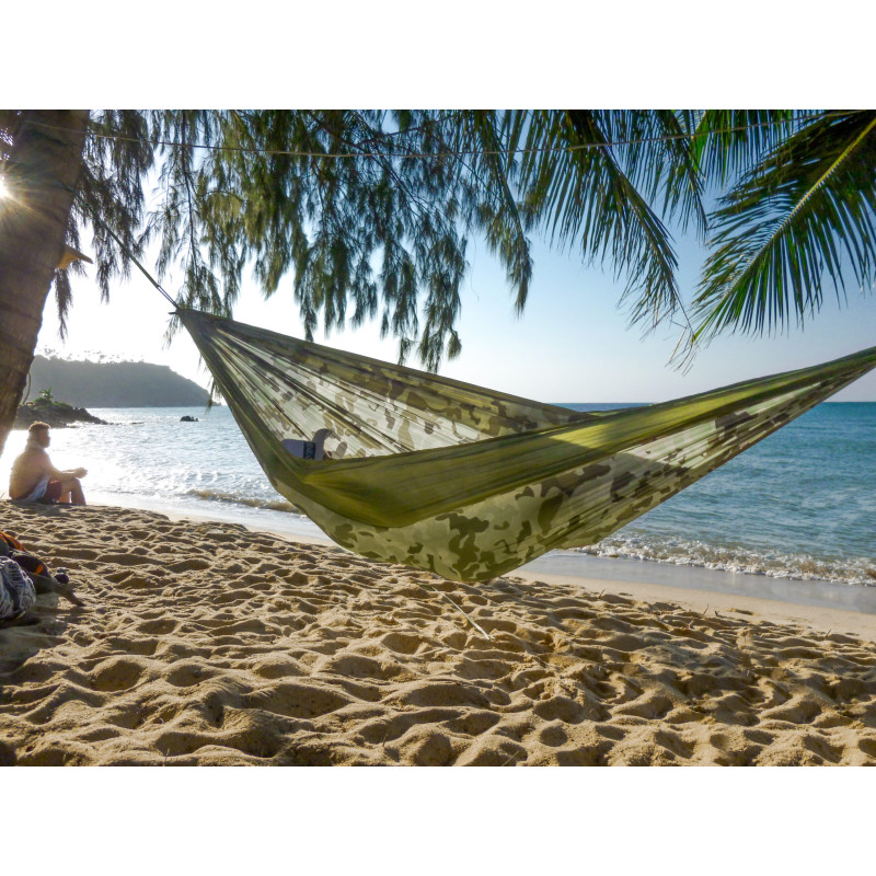 Для изготовления модели использовался особый парашютный материал. Главным преимуществом которого является необычайная мягкость. Кроме того, материал очень прочный – ведь не зря он используется для изготовления парашютов. Благодаря своей легкости, такой гамак очень простой в транспортировке, что очень удобно для дальнего путешествия. Ткань отлично пропускает воздух, позволяя коже дышать и обеспечивая приятную свежесть в знойные дни.