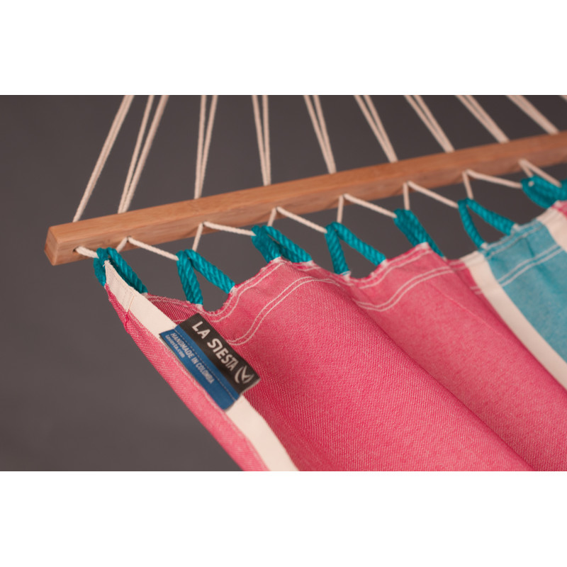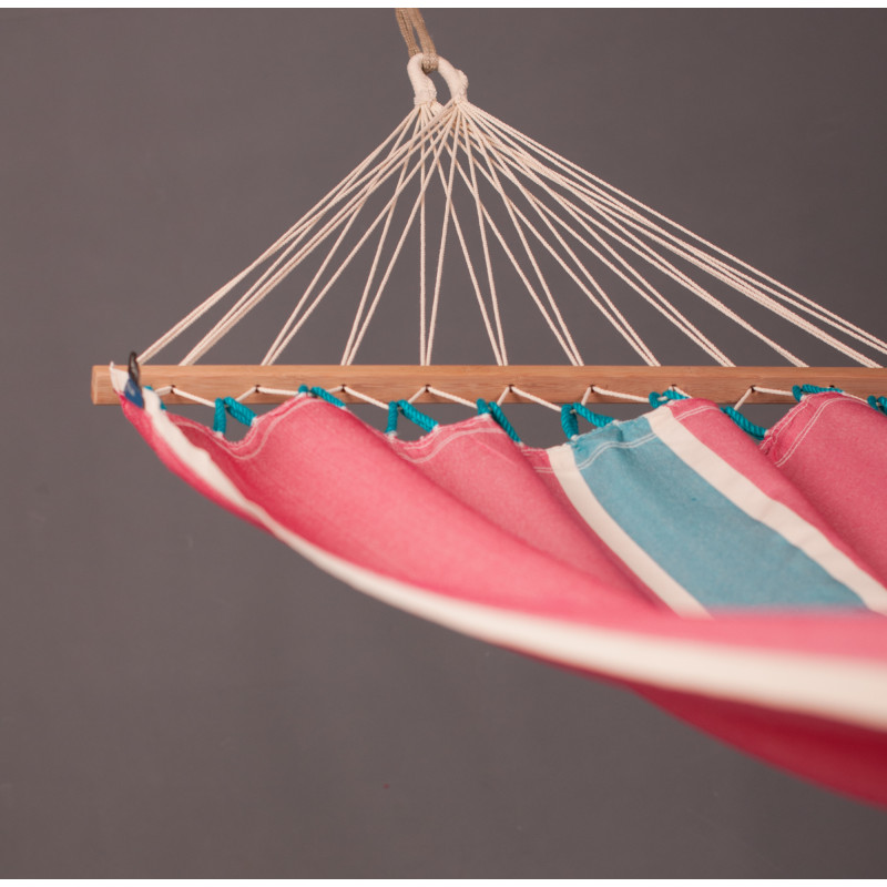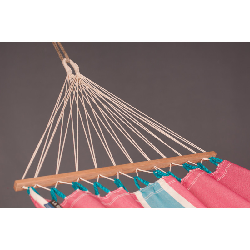 Надежное крепление к стойкам обеспечивается прочными крепкими канатами, которые равномерно распределяются всей ширине сукна. Главным преимуществом данной модели является наличие бамбуковой планки, которая расправляет и удерживает сукно по всей ширине. Прочный бамбук, имеет гладкую поверхность, которая не портится под воздействием атмосферных явлений. К тому же, гамак очень легко крепится в стойкам с помощью специальных петель. И даже, если расстояние между петлями слишком большой, в всегда можете удлинить гамак с помощью специального каната.