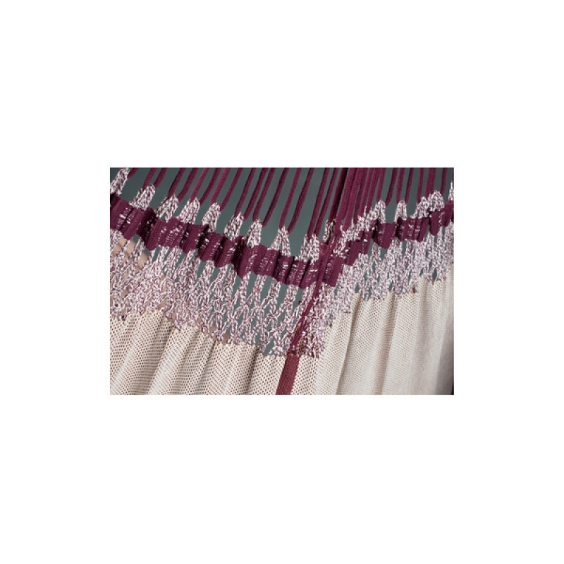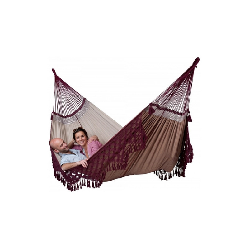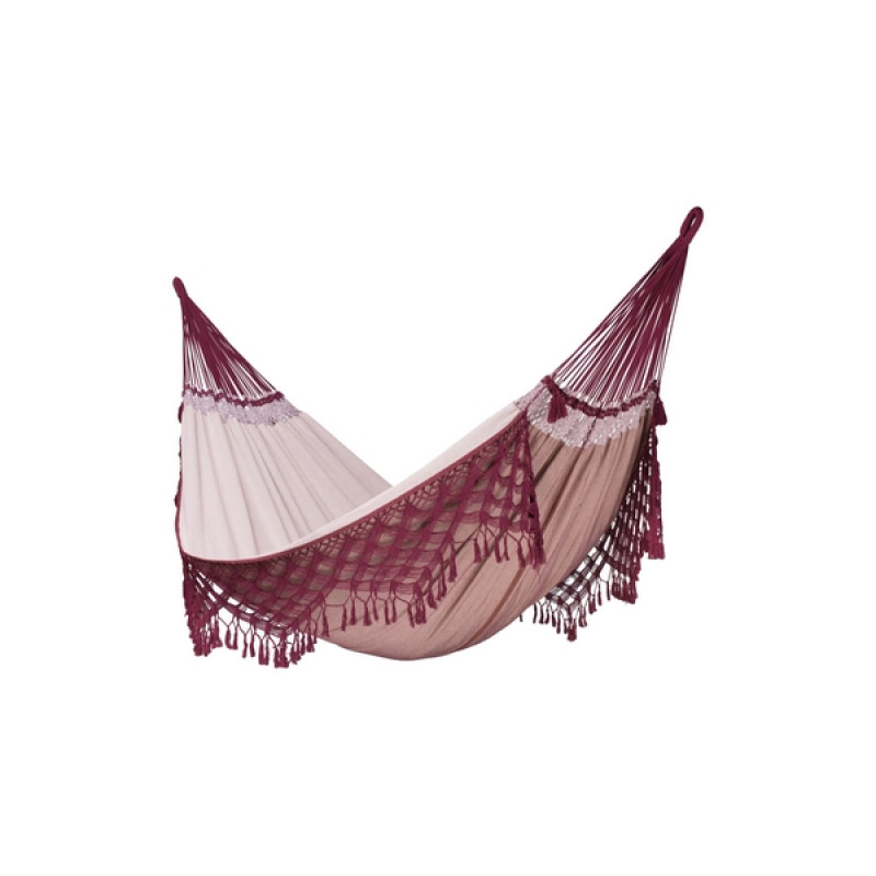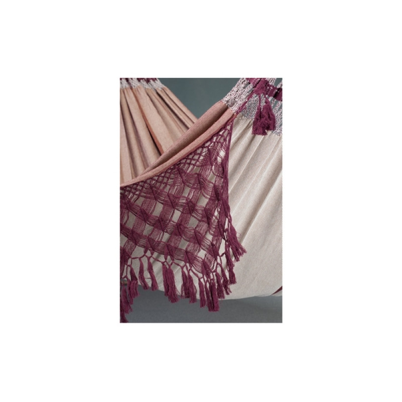 Изюминкой данной модели является отделка краев кружевами ручной работы. Изящные кружева гармонично сочетаются с бразильским макраме, которое соединяет сукно для лежания и канаты для крепления. Украшенная бахромой плетеная сеть – это не только эстетическое украшение, но и практичное решение, так как прочная сетка обеспечивает равномерное распределение массы тела по всему сукну. Сочетание насыщенного цвета бордо и легкого лилового цвета придает дизайну изысканность и подчеркивает отменный вкус владельца.