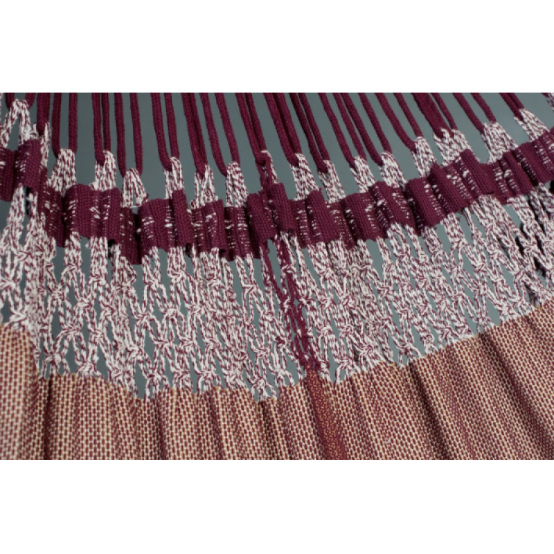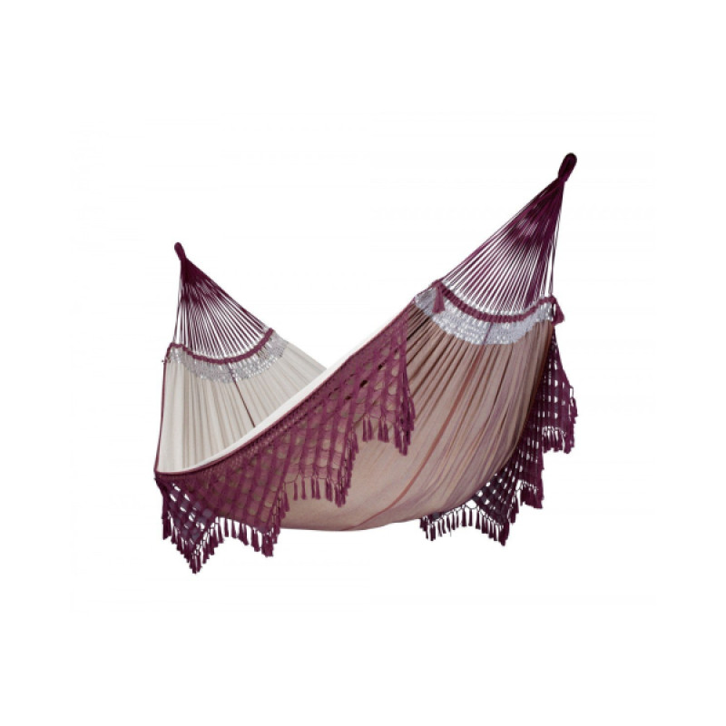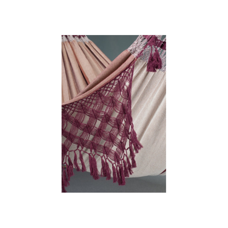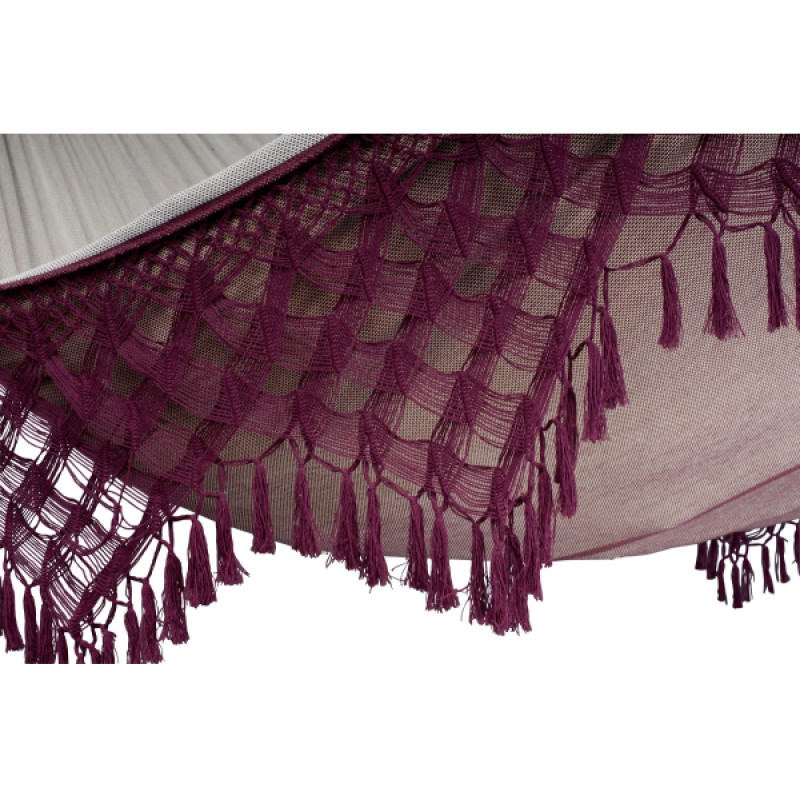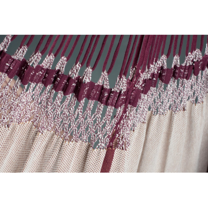 Изюминкой данной модели является отделка краев кружевами ручной работы. Изящные кружева гармонично сочетаются с бразильским макраме, которое соединяет сукно для лежания и канаты для крепления. Украшенная бахромой плетеная сеть – это не только эстетическое украшение, но и практичное решение, так как прочная сетка обеспечивает равномерное распределение массы тела по всему сукну. Сочетание насыщенного цвета бордо и легкого лилового цвета придает дизайну изысканность и подчеркивает отменный вкус владельца.