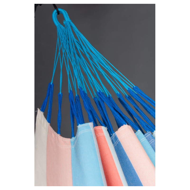 Традиционная колумбийская открытая петля для подвешивания позволяет за считанные минуты зафиксировать гамак и так же быстро его убрать. Крепкие канаты, распределяясь по всей ширине гамака обеспечивают поддержание ровного положения спины и равномерное распределение веса тела по всему пространству для лежания.