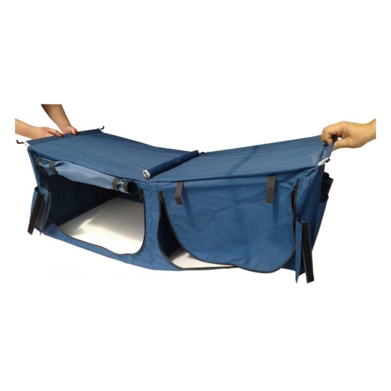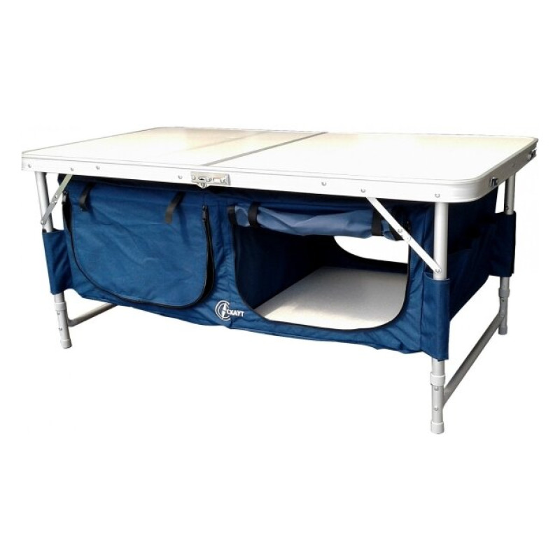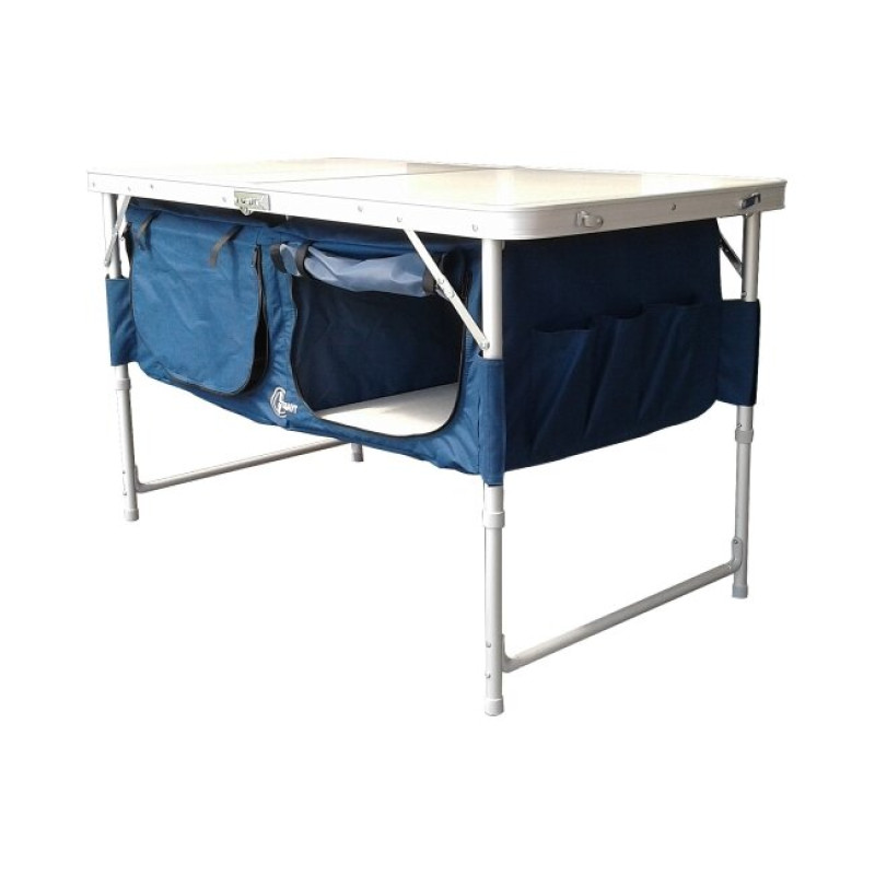Міцність і легкість столу забезпечується алюмінієвим каркасом з труби діаметром 25 мм щоб зберігати посуд до ніжок тола на "липучці" кріпиться секція з міцного непромокаючого поліестеру 600 D. секція має два відділення. Для зручності експлуатації, обидва відділення з двох сторін мають блискавки на подвійних замочку Для забезпечення жорсткості на дно відділень укладається пластик На двох інших сторонах секції передбачено по три кишеньки для ложок, виделок і іншого, щоб уникнути мимовільного складання столу, на торцях передбачені фіксатори Стійкість положення столу забезпечується ломберная петля на ніжках столу Два варіанти висоти В складеному вигляді стіл являє собою валізу з ручкою. У комплект входить чохол для зберігання.