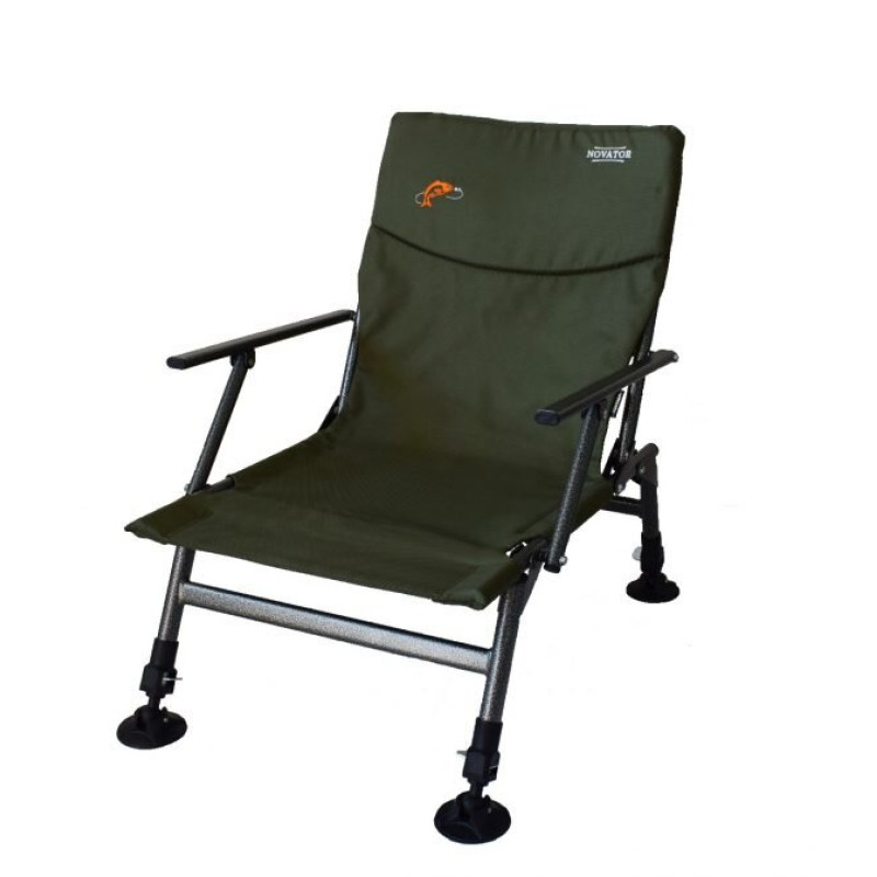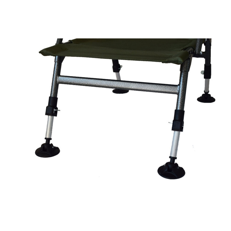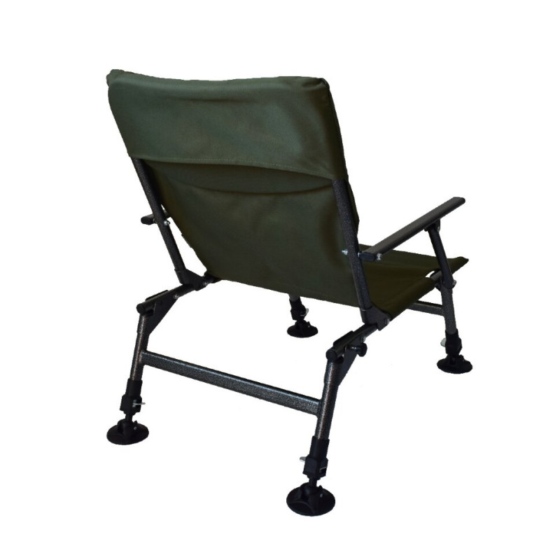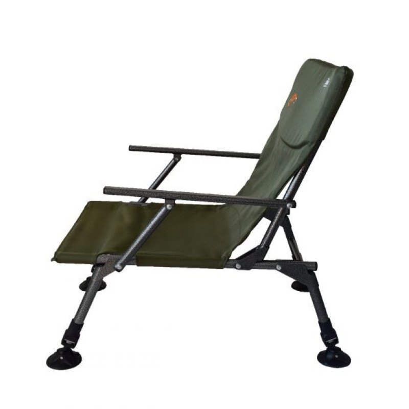 Крісло виготовлено з міцного водонепроникного матеріалу Охфорд 1200д кольору хакі. Дане крісло зробить вашу риболовлю чистим задоволенням. Повністю розсувні ніжки, що фіксуються в потрібній позиції з широкими обертовими опорами дозволять йому бути більш стійким на м'якому грунті. Не викликає проблем при транспортуванні, так як в складеному вигляді габаритні розміри крісла 80 х 55 х 15 см. Вага 5,1 кг.