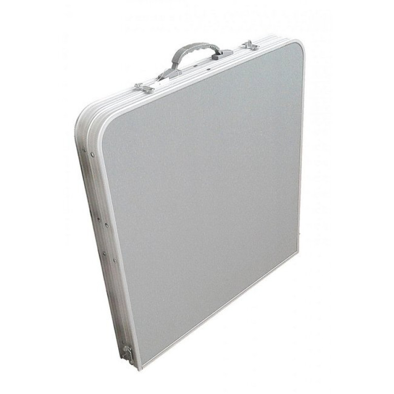 Стільниця легко витримає навантаження в 30 кг, завдяки спеціальним металевим розпіркам знизу столу. Матеріал ніжок і каркаса столу-алюміній, що значно полегшує вагу і його зручно і комфортно транспортувати. Ніжки Телескопічні, регулюються в двох положеннях по висоті. Стіл складається навпіл і виходить компактний чемоданчик, який легкістю зможе перенести навіть підліток. Обидві частини стільниці скріплюються спеціальним гачком для більшої стійкості. Що ще важливо, ніжки не провалюються в грунт завдяки спеціальній трубці скріплює ніжки з обох сторін.