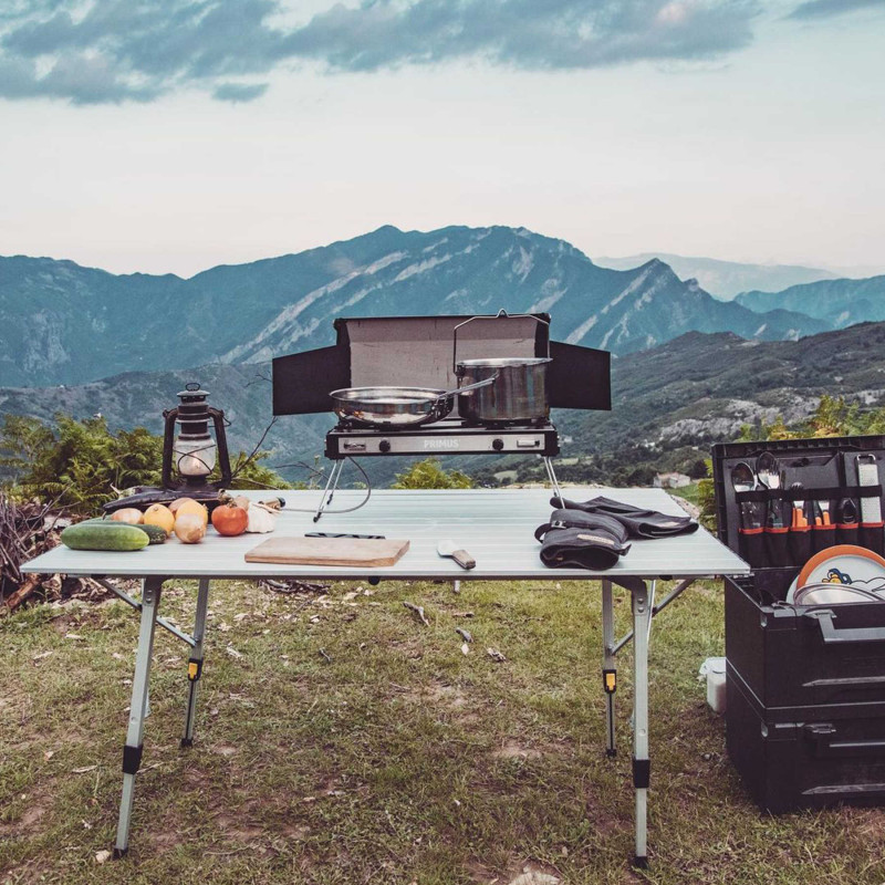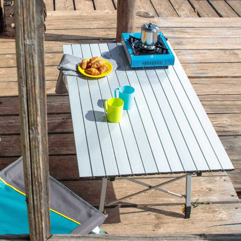 Столешница имеет достаточные размеры, чтоб за столом комфортно разместились 6 человек. В сложенном виде стол компактно размещается в чехле. Алюминиевая поверхность столешницы легко чистится, и является максимально гигиеничной, поскольку алюминий не формирует среду для размножения микробов.