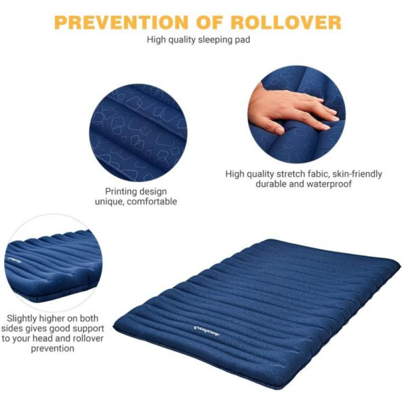 Немного выше с обеих сторон, чем в центре, он обеспечивает необходимый комфорт и тепло. И не беспокойтесь о том, чтобы спать на полу. Надутый размер от 195 x 130 x 10-13 см, что достаточно для большинства людей. Размер упаковки 38х16х16 см. Вес составляет всего 2 кг, что очень удобно для переноски и идеально подходит для пеших прогулок, кемпинга и ночлега. Верхняя ткань — удобная и прочная, из 100% полиэстера, эластичная ткань 30D с покрытием TPU, низ — полиэстер 190T с покрытием TUP. Эта накладка приятна на ощупь, водонепроницаема, устойчива к разрыву, очень прочная. Конструкция толщиной от 10 до 13 см гарантирует, что вы не почувствуете неровности скал или неровностей земли, обеспечивая максимальный комфорт в ночное время. Этот спальный коврик разработан с использованием высококачественной клапанной системы и материалов, которые очень легко надуть и сдуть с помощью защитной насадки из ТПУ. Вы можете надуть его с помощью обычного аккумуляторного насоса или надуть ртом. Он дольше задерживает воздух, поэтому вы сможете хорошо выспаться на этом качественном матрасе. Два патча могут помочь вам исправить после случайной поломки.