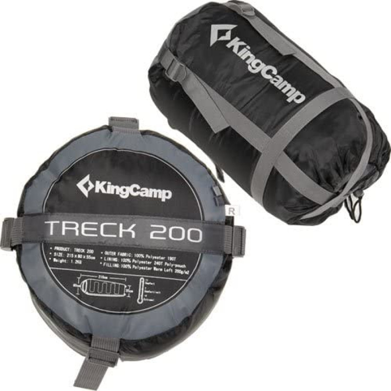 Спальний мішок-кокон KingCamp Treck 200 є відмінним трехсезонным спальником, обладнаним зручним підголовником. Дана модель буде незамінною для любителів активних видів відпочинку, дозволяючи комфортно відпочивати навіть при низьких температурах навколишнього середовища (екстремально допустима температура, при якій користувач не буде мерзнути, досягає -4°C). Спальний мішок KingCamp Treck 200 в якості наповнювача використовують синтетичний матеріал щільністю 200 г/м2 Warm Loft, що у поєднанні з внутрішнім Poly-cotton і зовнішнім 190T Polyester W/P Cire забезпечує ідеальну теплоізоляцію і комфорт. Закриваючись на двосторонню застібку-блискавку з клапаном для запобігання заїдання, цей теплий спальний мішок здатний ефективно укрити від холоду і подарує приємні спогади про відпочинок.