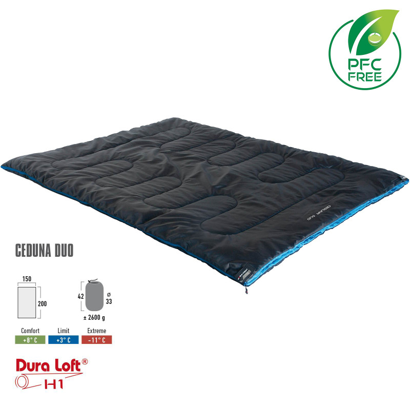 High Peak Ceduna Duo - двухместный спальный мешок, выполненный в форме одеяла с чехлом в комплекте. Мягкая внешняя оболочка не содержит PFC-соединений, имеет водоотталкивающую пропитку, выполненную по экологически чистой технологии Bionic-Finish® Eco. Внутренняя подкладка спальника дышащая и благоприятная для кожи. Спальный мешок имеет высококачественный наполнитель Dura Loft® с превосходными изоляционными свойствами. Материал Dura Loft® легко сжимается, долговечен, сохраняет тепло даже во влажных условиях, быстро сохнет. Спальный мешок High Peak Peak Ceduna Duo оснащен внутренним карманом для хранения ценных вещей и длинной двусторонней молнией. Застежка имеет эргономичную форму для удобного хвата рукой. Спальный мешок рассчитан на рост пользователей до 190 см, предназначен для кемпинга.
