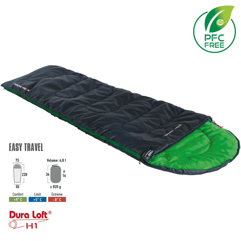 High Peak Easy Travel - легкий спальный мешок, выполненный в форме кокона с небольшим чехлом в комплекте. Мягкая внешняя оболочка не содержит PFC-соединений, имеет водоотталкивающую пропитку, выполненную по экологически чистой технологии Bionic-Finish® Eco. Внутренняя подкладка спальника дышащая и благоприятная для кожи. Спальный мешок имеет высококачественный наполнитель Dura Loft® с превосходными изоляционными свойствами. Материал Dura Loft® легко сжимается, долговечен, сохраняет тепло даже во влажных условиях, быстро сохнет. Спальный мешок High Peak Easy Travel оснащен регулируемым капюшоном, внутренним карманом для хранения ценных вещей и длинной двусторонней молнией. Это позволяет открыть нижнюю часть спальника в теплые ночи. Молния закрыта ветрозащитной перегородкой, застежка имеет эргономичную форму для удобного хвата рукой. Спальный мешок рассчитан на рост пользователя до 190 см, предназначен для туристических походов и посещения фестивалей. Спальный мешок High Peak Easy Travel соответствует международному стандарту DIN EN ISO 23537, который нормирует требования к размерам и тепловым характеристикам спальных мешков, а также к свойствам ткани и используемым материалам. Обратите внимание, что только сертифицированные спальные мешки соответствуют заявленным температурным режимам и гарантируют Вам тепло и комфорт продолжительное время, не смотря на холод и сырость.