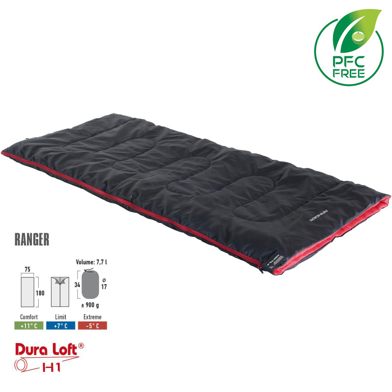 High Peak Ranger - бюджетный спальный мешок, может использоваться как одеяло, поставляется с небольшим чехлом. Мягкая внешняя оболочка не содержит PFC-соединений, имеет водоотталкивающую пропитку, выполненную по экологически чистой технологии Bionic-Finish® Eco. Внутренняя подкладка спальника дышащая и благоприятная для кожи. Спальный мешок имеет высококачественный наполнитель Dura Loft® с превосходными изоляционными свойствами. Материал Dura Loft® легко сжимается, долговечен, сохраняет тепло даже во влажных условиях, быстро сохнет. Спальный мешок High Peak Peak Ranger оснащен внутренним карманом для хранения ценных вещей и длинной двусторонней L-образной молнией. Это позволяет открыть нижнюю часть спальника в теплые ночи. При наличии двух одинаковых спальников их можно соединить в один двухместный. Застежка имеет эргономичную форму для удобного хвата рукой. Спальный мешок рассчитан на рост пользователя до 170 см, предназначен для летнего кемпинга и посещения фестивалей.