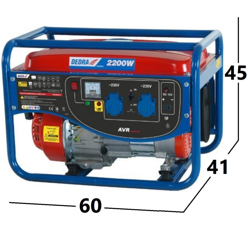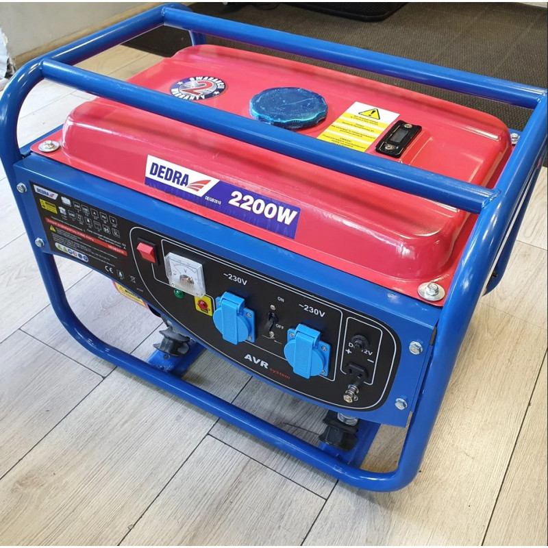 ензиновый генератор Dedra DEGB2510 однофазный с 4-тактным двигателем, максимальной мощностью 2,2 кВт. Имеет ручной старт.Основное предназначение для аварийного электроснабжения: домов, офисов, автомобилей, во время кемпинга на отдыхе, в автодомах, грузовиках, тракторах, легковых автомобилях, на катерах, яхтах, в промышленном оборудовании.Данная модель рассчитана на более жесткие условия эксплуатации, открытый корпус обеспечивает более быстрое охлаждение двигателя, надежные металлические дуги защищают от внешних повреждений.Вид генератора: бензиновыйЗапуск двигателя: ручной стартерНоминальная мощность: 2 кВтМаксимальная мощность: 2,2 кВтКоличество фаз: 1 фаза (220 В)Режим работы: резервный источник тока.Тип топлива: бензин 95 или 98.Модель двигателя LB168FТ4-тактный двигатель, 1 цилиндровый с мощностью двигателя в 5 л.с.Объем двигателя: 163 куб. см.Количество оборотов двигателя: 3000 об/мин.Расход топлива на 1 кВт/ч: 0,4 лРасход топлива при 100% нагрузке: 1,25 л/чОхлаждение двигателя: воздушноеОбъем масляного картера: 0,6 лАвтономная работа: 12 час.Вид альтернатора: синхронныйТехнические особенности: 2 розетки на 220 В, выход на 12 ВCos φ: 0,8Управление воздушной заслонкой: ручноеУровень шума, 7м: 76 дБОбъем топливного бака: 15 лГарантия: 12 мес.Страна-производитель: Польша.Размеры: 60х41х45 (ДхШхВ)Вес: 34 кг.