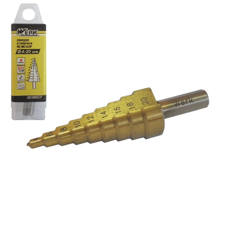 Описание характеристики: Сверло ступенчатое 4-20 мм. Хвостовик: Шестигранный. К-во ступеней: 9 шт.