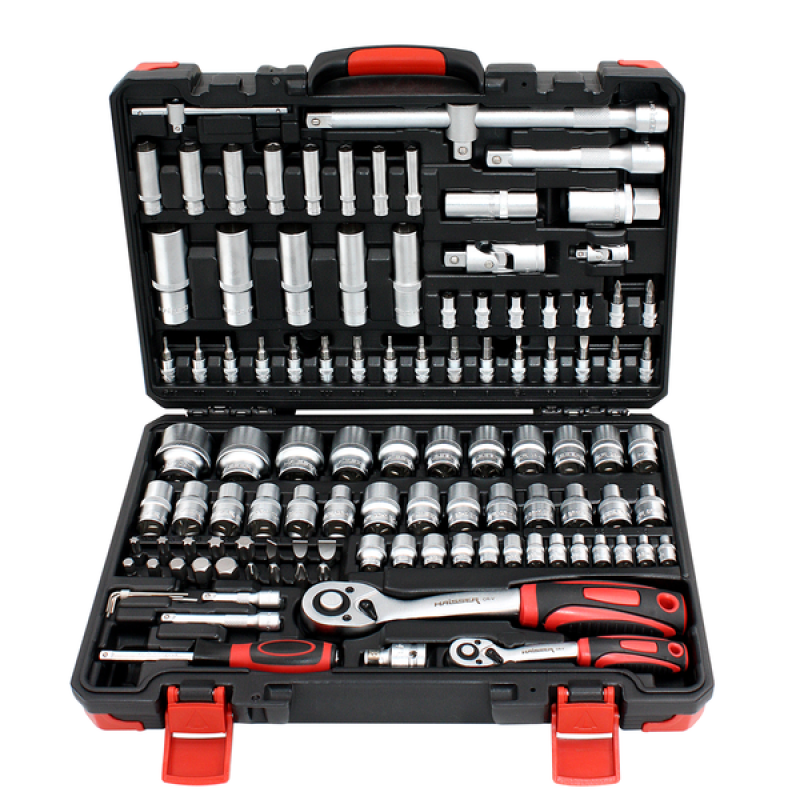 Торцевые головки 1/4?: 4, 4.5, 5, 5.5, 6, 7, 8, 9, 10, 11, 12, 13, 14 мм – 13 шт,Торцевые головки удлиненные 1/4?: 6, 7, 8, 9, 10, 11, 12, 13 мм – 8 шт,Торцевые Е-головки 1/4?: Е4, Е5, Е6, Е7, Е8 – 5 шт,Удлинители 1/4?: 50 мм, 75 мм – 2 шт,Вороток 1/4? – 1 шт,Рукоятка 1/4” 150 мм – 1 шт,Карданный шарнир 1/4? – 1 шт,Трещотка с реверсом 1/4? 72 Зуба – 1 шт,Торцевые биты 1/4?: SL 4, 5.5, 6.5, РН 1, 2, PZ 1, 2, HEX 3, 4, 5, 6, Т 8, 10, 15, 20, 25, 27, З0 – 18 шт,Биты: SL 8, 10, 12, РН 3, 4, PZ 3, 4, HEX 7, 8, 10, 12, 14, Т 40, 45, 50, 55, 60 – 17 шт,3-й адаптер 1/2?(M)x3/8?(F) – 1 шт,Торцевые головки 1/2?: 10, 11, 12, 13, 14, 15, 16, 17, 18, 19, 20, 21, 22, 24, 27, 30, 32 мм – 17 шт,Торцевые головки удлиненные 1/2?: 14, 15, 17, 19, 22 мм – 5 шт,Торцевые Е-головки 1/2?: Е10, Е11, Е12, Е14, Е16, Е18, Е20, Е24 – 8 шт,Свечные головки 1/2?: 16 мм, 21 мм -2 шт,Удлинители 1/2?: 125 мм, 250 мм – 2 шт,Карданный шарнир 1/2? – 1 шт,Держатель бит 1/2? – 1 шт,Трещотка с реверсом 1/2? 72 Зуба – 1 шт,Шестигранные ключи: 1.5, 2, 2.5 мм – 3 шт,Ударопрочный кейс – 1 шт.
