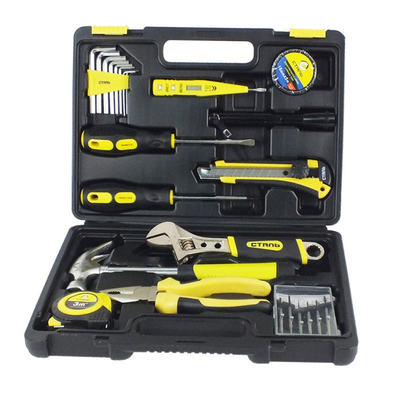 1шт плоскогубци 160 мм8шт Г-подобные ключи Нех 1.5, 2, 2.5, 3, 4, 5, 5.5, 61шт индикатор1шт фонарик1шт рулетка 3 м х 16 мм1шт разводной ключ 200 мм1шт нож, 18 мм2шт отвертки РН2 6 мм х 1 мм, РН1 4 мм х 0,5 мм6шт отвертки для точной механики1шт изолента 5 м1шт молоток-гвоздодер 1шт кейс