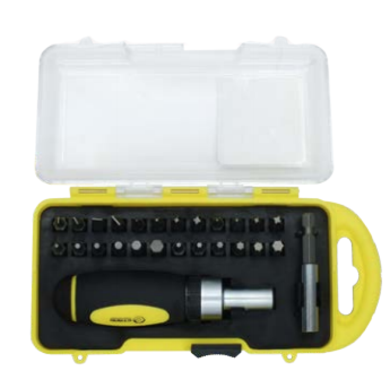 - Отвертка с трещоткой - 1 шт.- Магнитный держатель 60 мм - 1 шт.- Биты 25 мм - 24 шт:SL 3, 4, 5, 6PH 0, 1, 2, 3PZ 0, 1, 2, 3TORX 10, 15, 20, 25, 30, 40 HEX 2, 2,5, 3, 4, 5, 6- Пластиковый футляр
