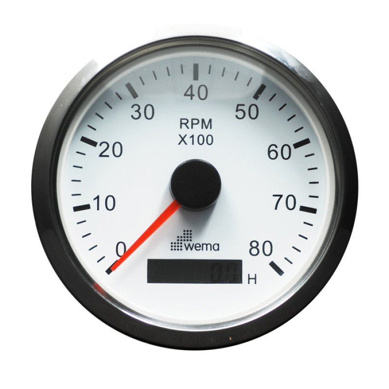 Тахометр и датчик моточасов Wema (Kus) белый Китай K-Y070107 Тахометр универсальный со встроенным счетчиком моточасов. Для индикации наработанных моточасов в циферблат тахометра встроен жидкокристаллический дисплей.Показания счетчика хранятся в энергонезависимой памяти.Диапазон измеряемых оборотов — 0-8000 об/минНапряжение питания — 12/24В.Диаметр установочного отверстия — 85 мм.Подсветка шкалы — красного или желтого цветаУдобный интерфейс предварительного программирования под любой тип стационарного или подвесного двигателяЦиферблат белого цвета, обод из нержавеющей стали. Тахометр выполнен в брызгозащищенном исполнении и предназначен для использования в составе приборной панели лодок и катеров.Все приборы этой серии изготовлены подразделением компании Wema Group