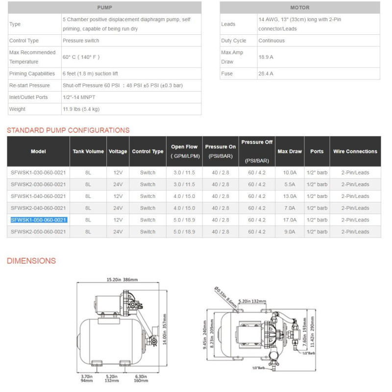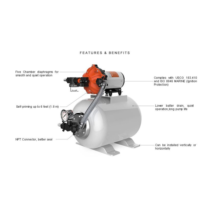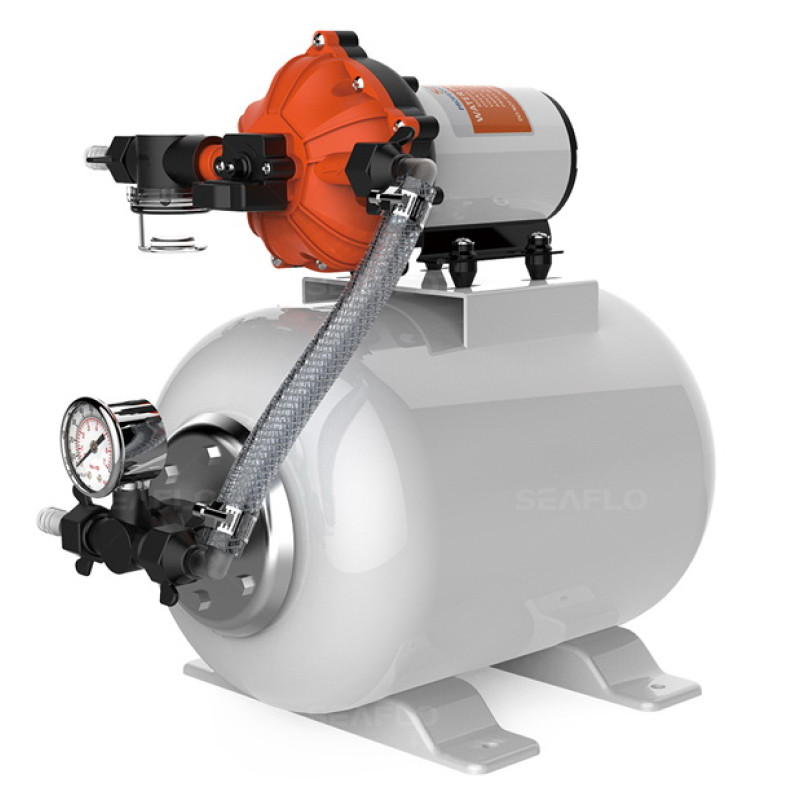 Помпа с аккумулирующим баком SFWSK1-050-060- 021 SEAFLOемкость бака 8 литров, поток воды 18,9 литров в минуту