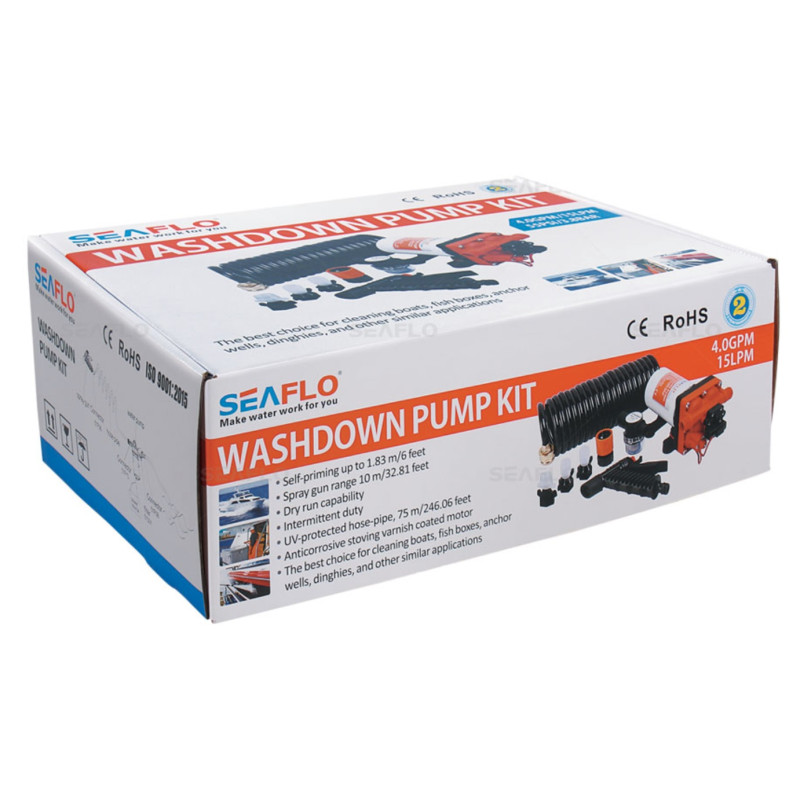 Помывочный комплект SEAFLO SFWP1-040-055-42A 15 л/мин 55PSI Наш сверхмощный комплект для мытья посуды, палубы и прочего. Лучший выбор для мытья лодки, ящиков для рыбы, якорных колодцев, шлюпок и других подобных применений. Насос имеет огромную производительность 15 литров в минуту. Насос снабжен автоматическим переключателем, поэтому насос автоматически включается при нажатии на ручку распылителя. С отсечкой в достижении давления 55 PSI. Подходит для применения в пресной и морской воде.