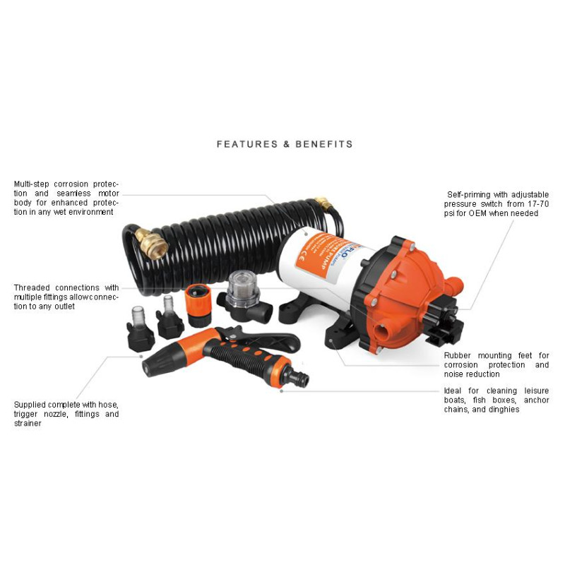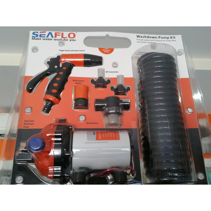 Повымочный комплект SFWP1-050-070-51 SEAFLOПомывочный комплект SEAFLO SFWP1-050-070-51 20л/мин 12В идеально подходит для очистки палубы судна, якорных цепей, резиновой лодки. Водоподающая мембранная помпа энергоэкономична и практически бесшумна. Мембраны изготовлены из сантропрена термопластичной резины. Предусмотрена защита от перегрева и возгорания, продолжительный режим работы. Клапан удобно расположен на прорезиненной насадке. Насос создает давление до 70 psi (4.8 бар). Расход воды до 20 литров в минуту. Напряжение питания 12 (В). Форсунки, арматура и шланг в комплекте. Насос имеет реле давления, вллючается и выключается при нажатии спускового крючка на пульверизаторе.В комплект входит:трехкамерный диафрагменный насосшланг — 7.62 м (спиральный, с защитой от ультрафиолета, соединение 1/2? Hose — 12.7 мм)сетчатый фильтрпереходник для подключения шланганасадка с распылителем2 переходника 1/2» -14 FNPT (20.9 мм) x 1/2» Barb (12.7 мм)