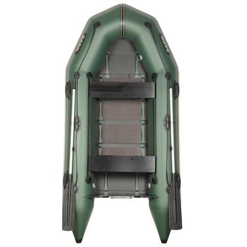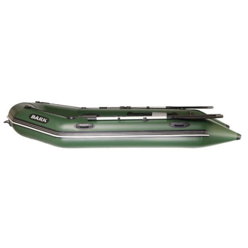 Ця човен з надувним кілем і жорстким збірним настилом - з найбільш спортивної і швидкісний серії човнів BARK. З мотором до 10к показує відмінну керованість і більш високу швидкість порівняно з іншими човнами приблизно такого самого розміру. Човен добре виходить на глиссирование. Привальний брус з бризгоотбойніком захищає борти від зіткнення і зайвого тертя (про опори причалу, очерет і т.п.), а пасажирів і кокпіт - від надмірного забризкування. Захисні молдинги на днище бережуть його від зайвого тертя при витягуванні на берег, перевезення на причепі. Незважаючи на «звужений» ніс, кокпіт дуже просторий. На цей човен можна встановити тент або човнову намет. Човен дуже комфортна для риболовлі будь-яким методом удвох (але досить зручна і для трьох рибалок); для сімейних водних прогулянок з досить довгим маршрутом. Порадує любителів швидкої їзди.У комплект поставки входить: